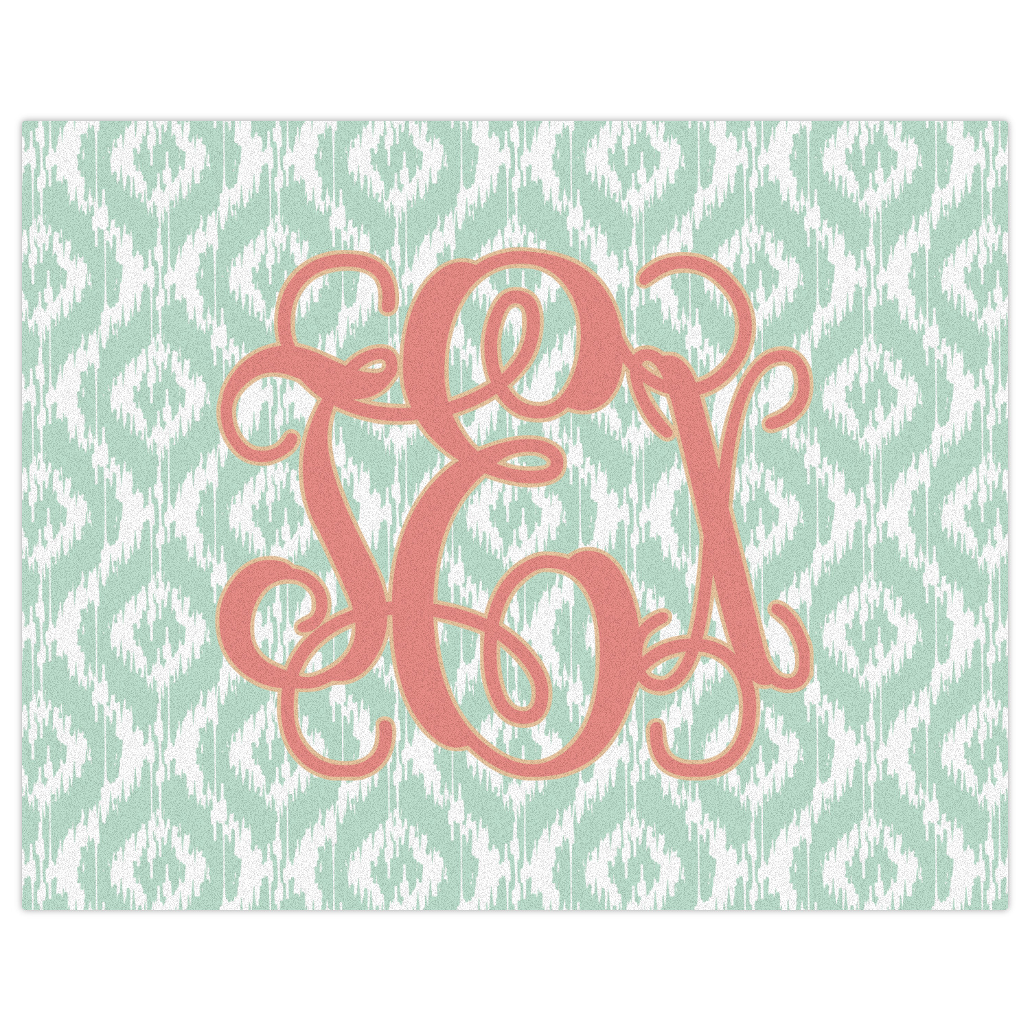 Are you a monogram-a-holic? Then, this design is perfect for you. With a subtle mint green ikat background, your monogram takes center stage in a bold coral. Let us indulge your obsession with this precious design!!