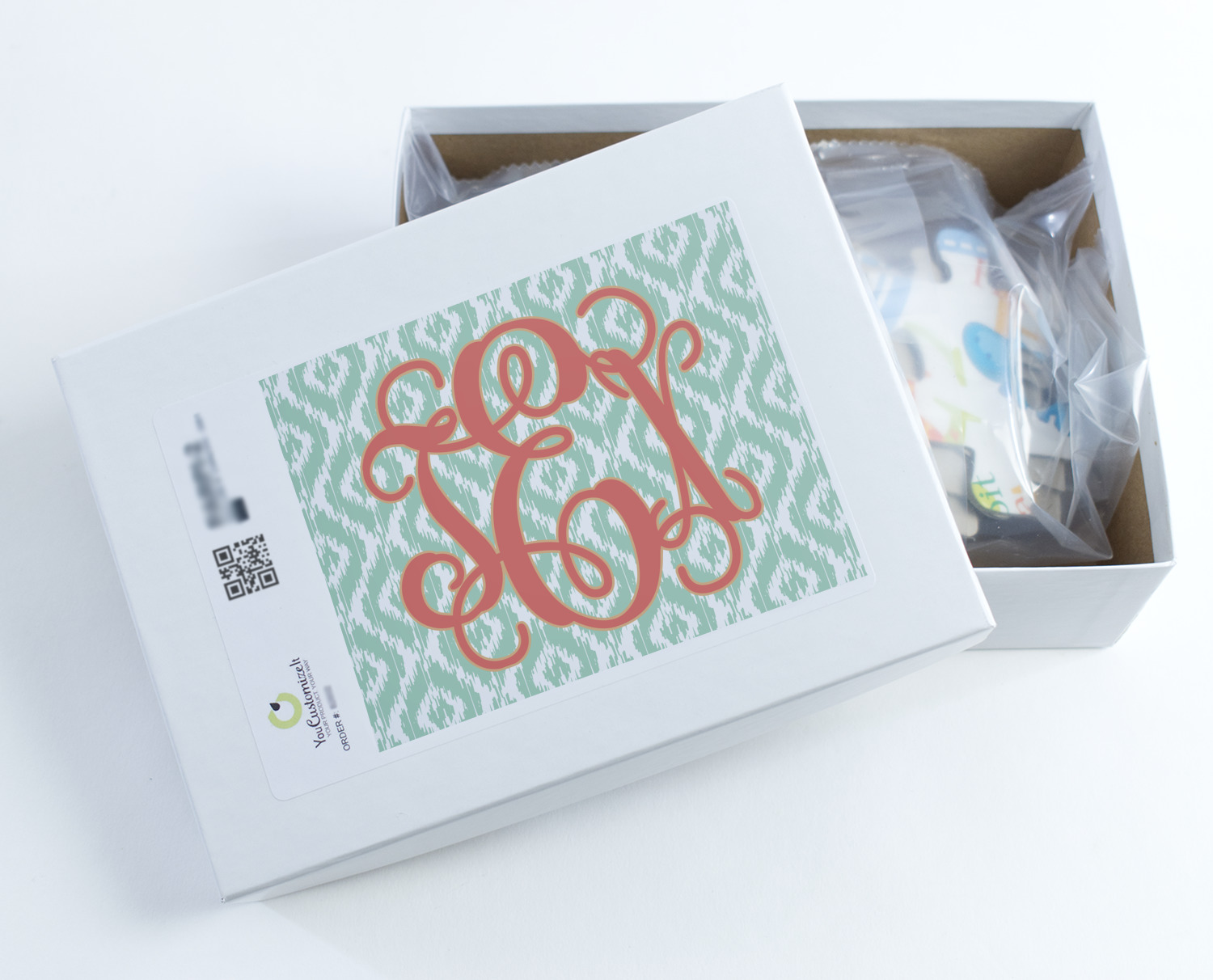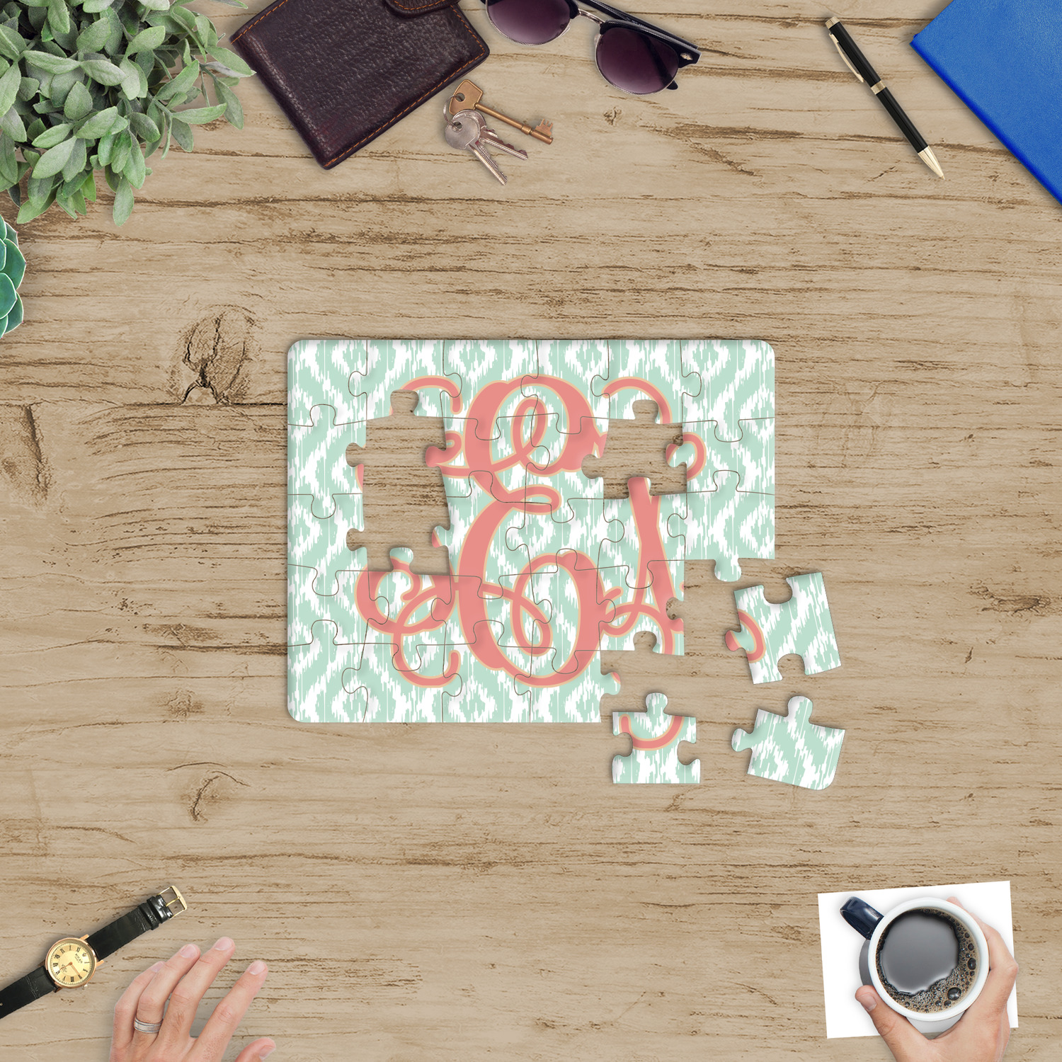 Are you a monogram-a-holic? Then, this design is perfect for you. With a subtle mint green ikat background, your monogram takes center stage in a bold coral. Let us indulge your obsession with this precious design!!