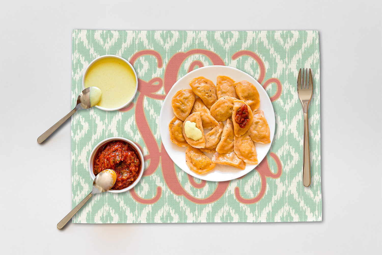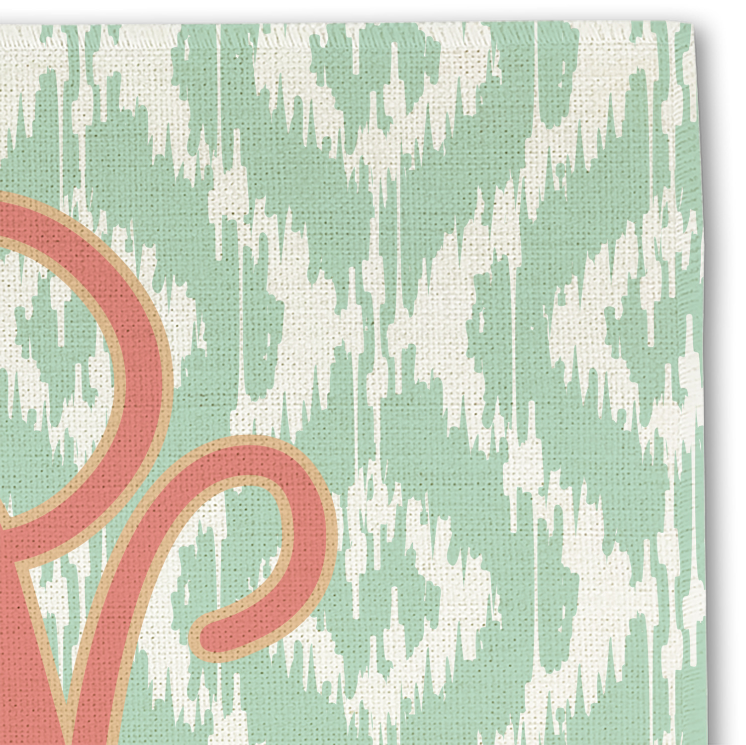Are you a monogram-a-holic? Then, this design is perfect for you. With a subtle mint green ikat background, your monogram takes center stage in a bold coral. Let us indulge your obsession with this precious design!!