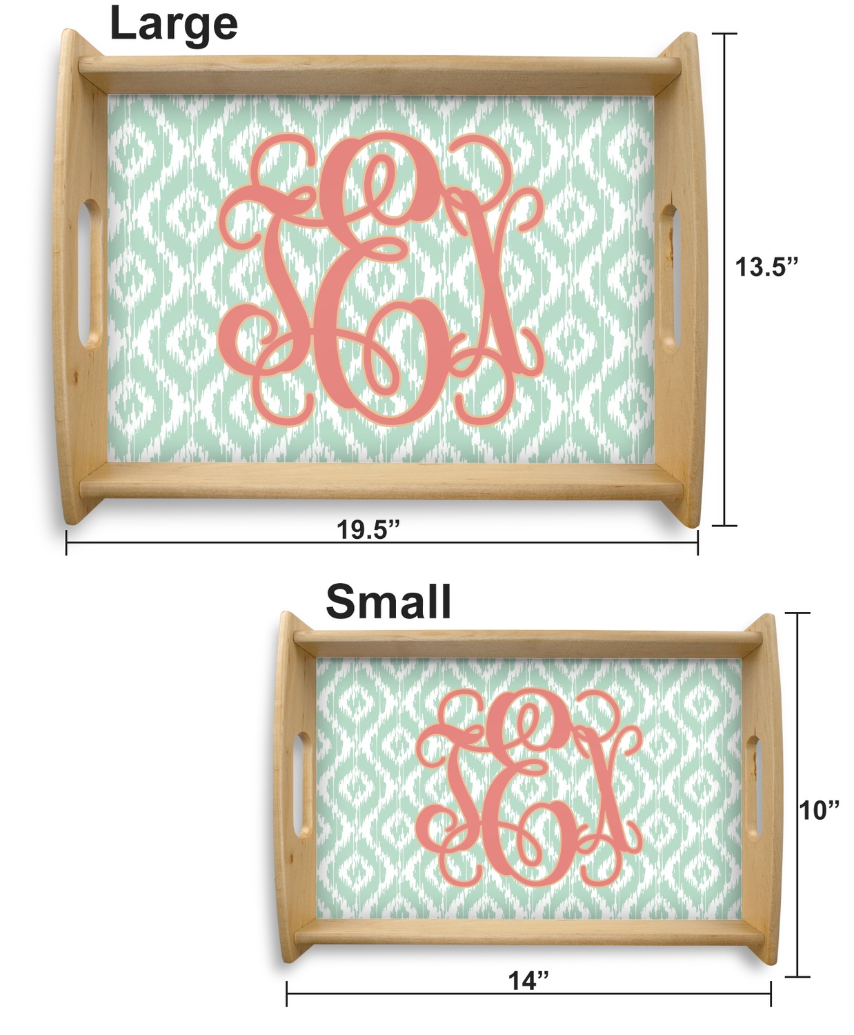 This serving tray with handles features square edges and two rounded sides, creating a very modern look. Each side is fabricated from a beautifully cut, natural wood. The bottom of the interior of the tray displays your customized design in bright, vibrant color. The tray is sold in both a black color and a natural wood look. Each variation of the wood serving tray has two sizes: Small, which is 14" x 10" x 2.25", and Large, which is 19.5" x 13.5" x 2.75".