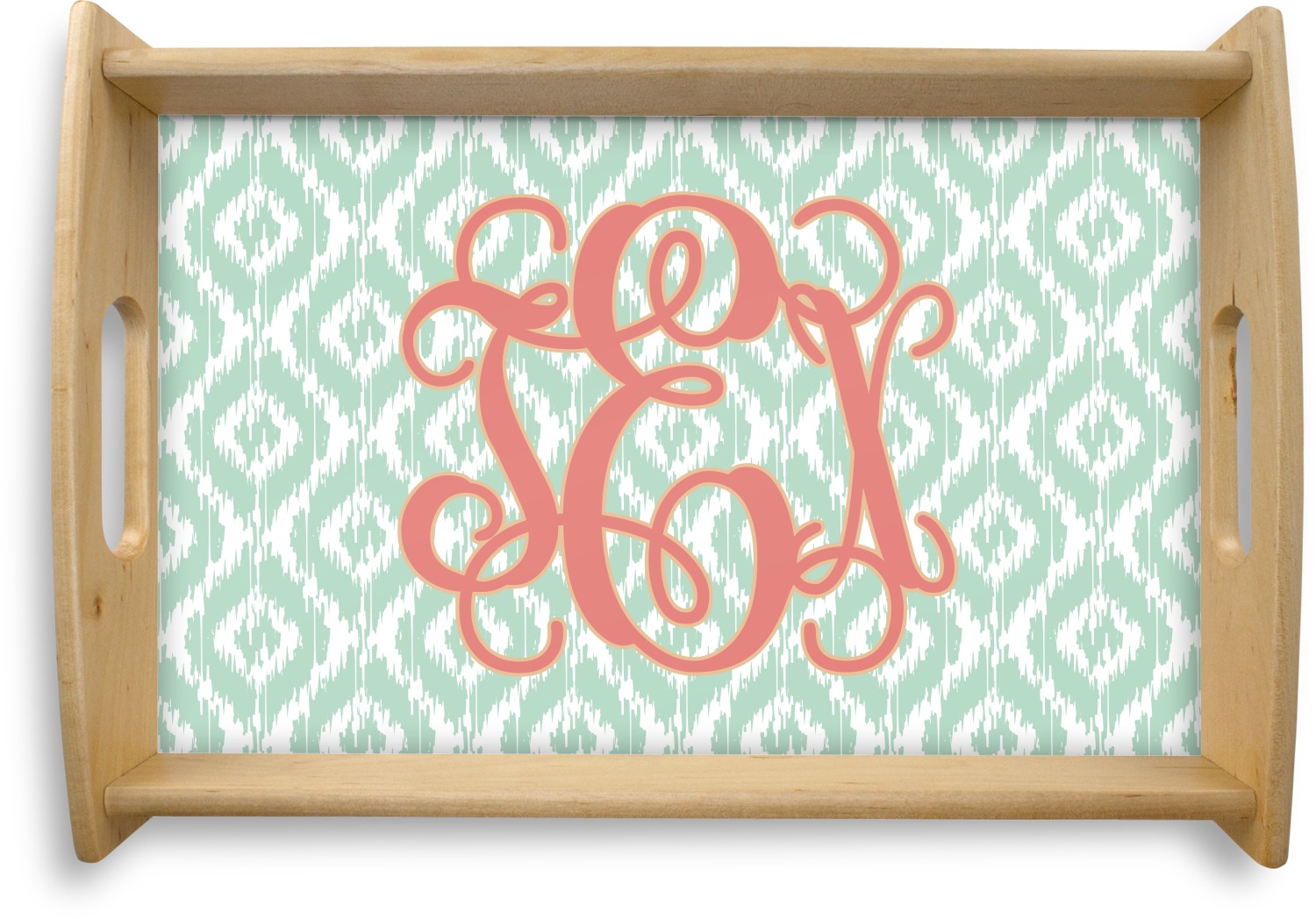 Are you a monogram-a-holic? Then, this design is perfect for you. With a subtle mint green ikat background, your monogram takes center stage in a bold coral. Let us indulge your obsession with this precious design!!