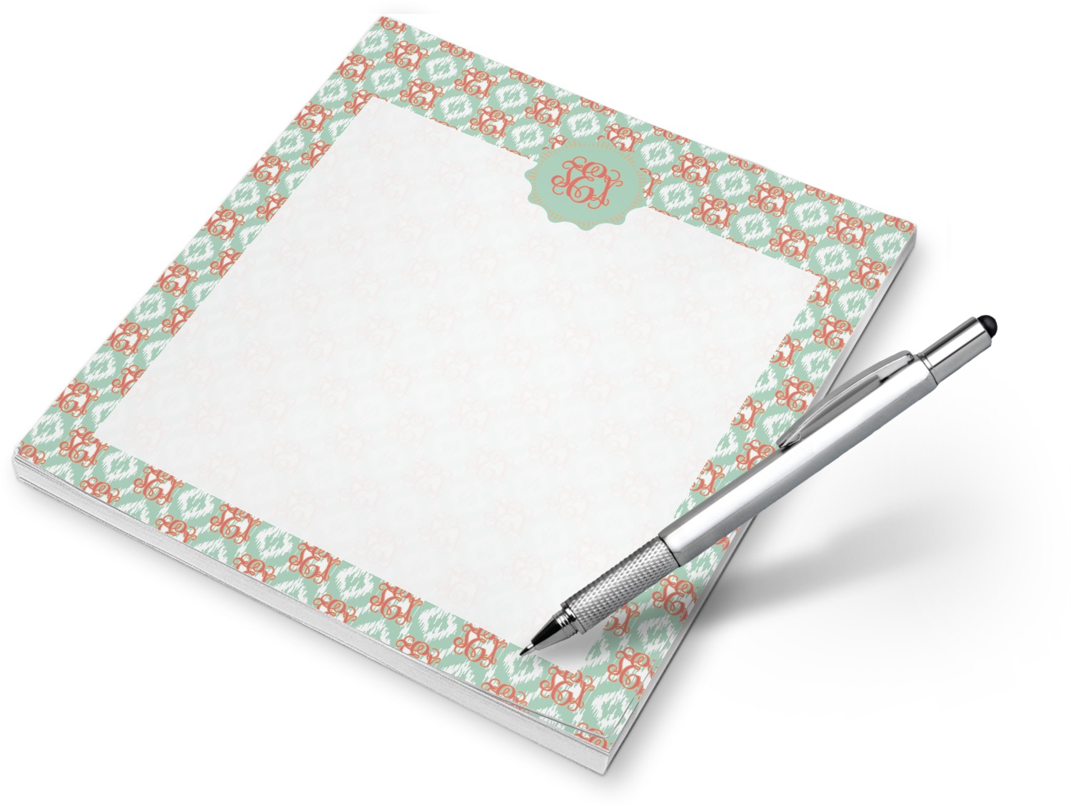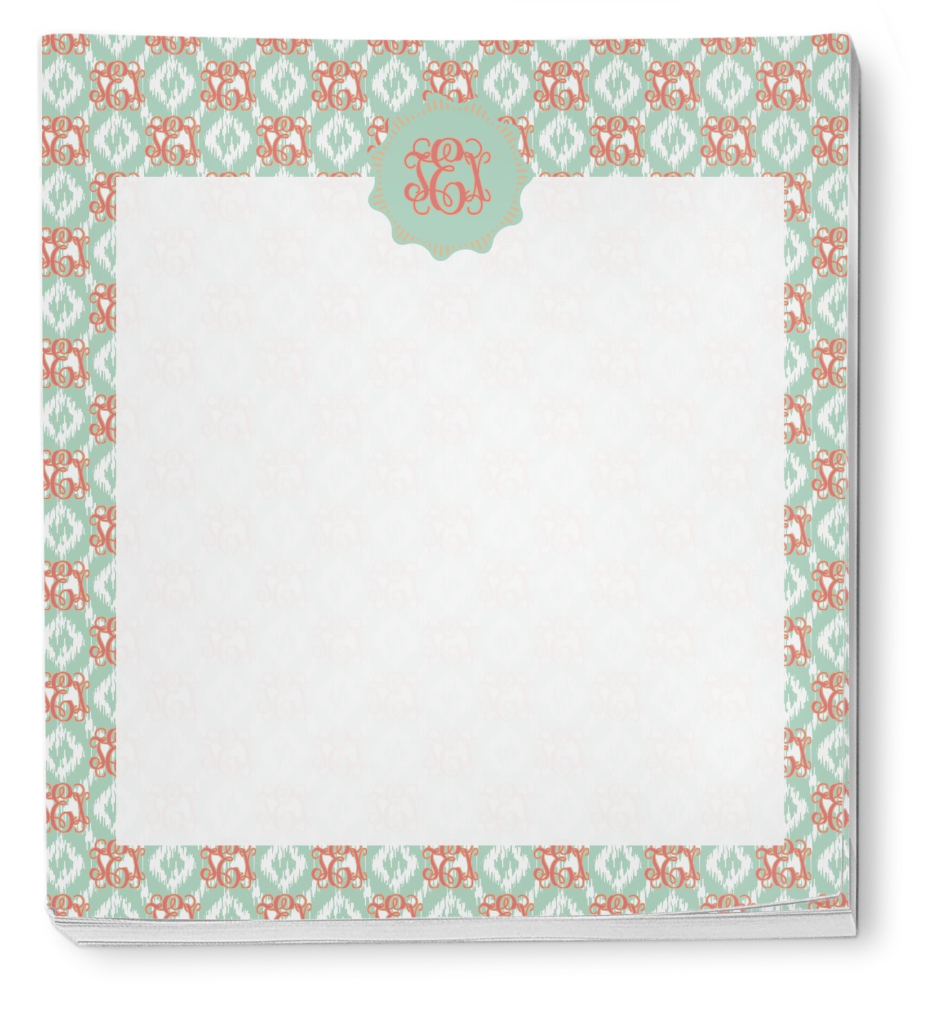Are you a monogram-a-holic? Then, this design is perfect for you. With a subtle mint green ikat background, your monogram takes center stage in a bold coral. Let us indulge your obsession with this precious design!!