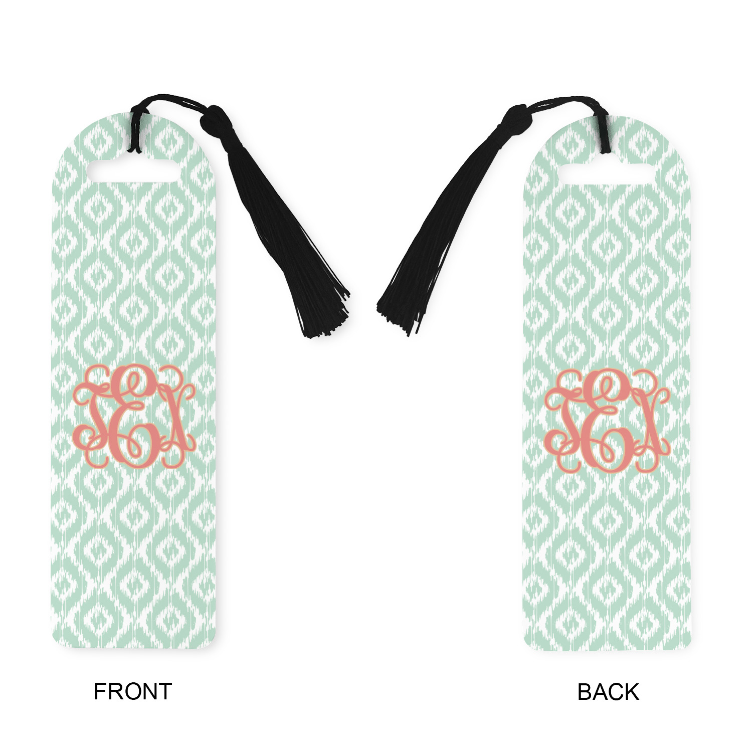 Are you a monogram-a-holic? Then, this design is perfect for you. With a subtle mint green ikat background, your monogram takes center stage in a bold coral. Let us indulge your obsession with this precious design!!