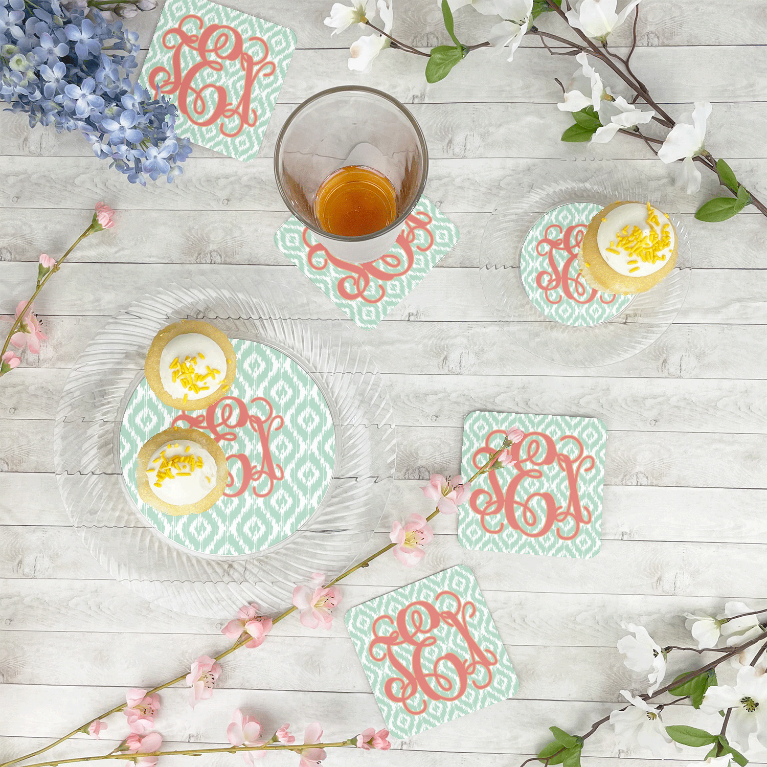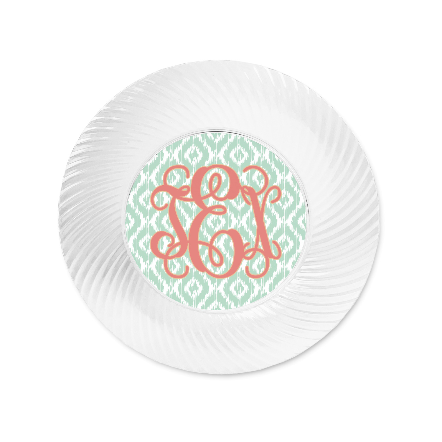 Are you a monogram-a-holic? Then, this design is perfect for you. With a subtle mint green ikat background, your monogram takes center stage in a bold coral. Let us indulge your obsession with this precious design!!