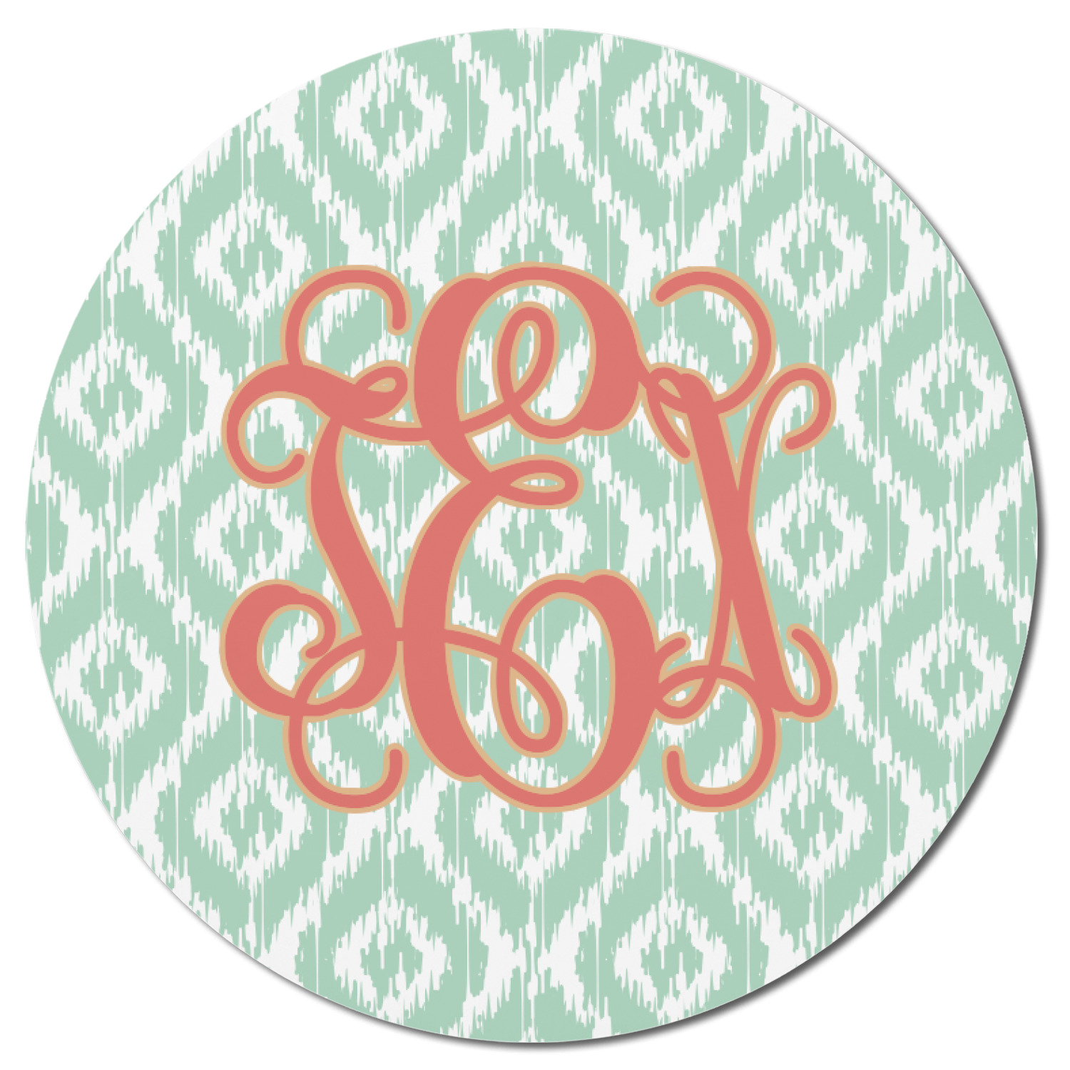 Are you a monogram-a-holic? Then, this design is perfect for you. With a subtle mint green ikat background, your monogram takes center stage in a bold coral. Let us indulge your obsession with this precious design!!