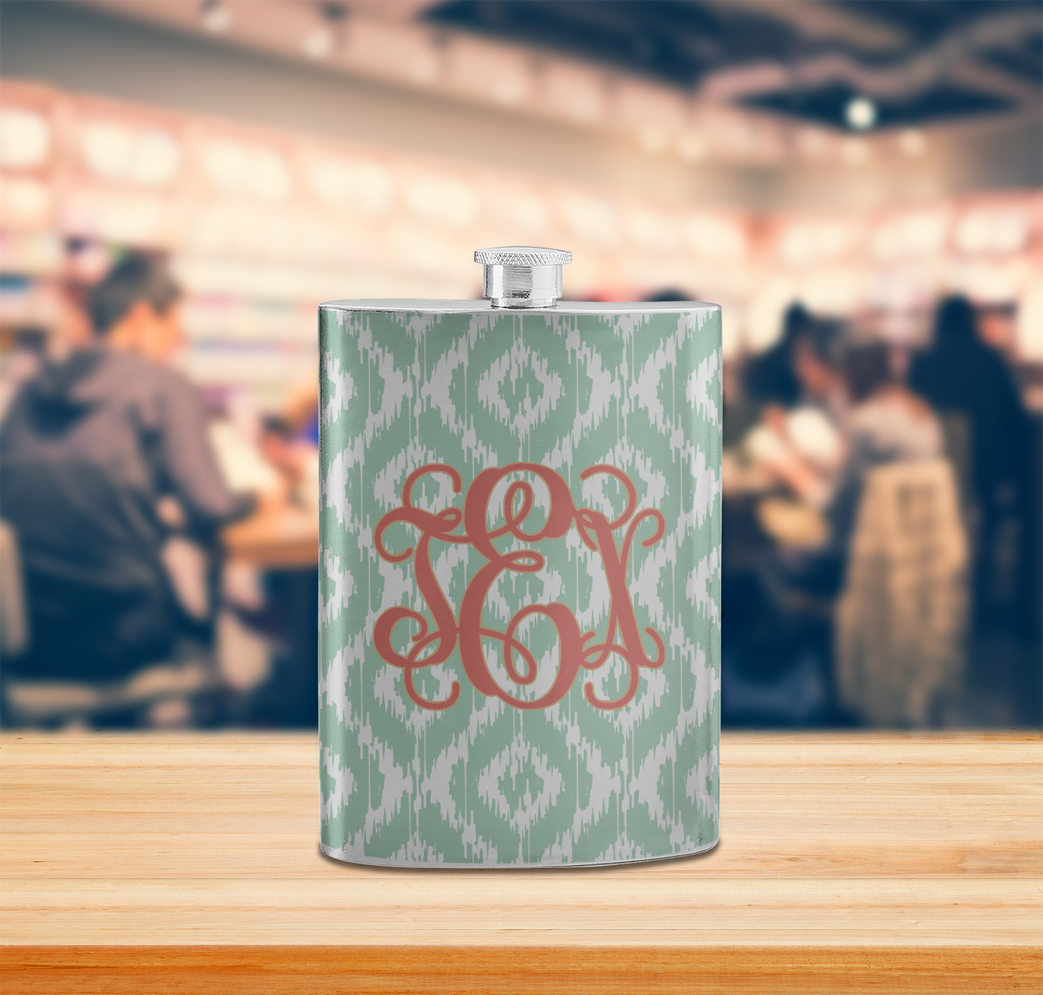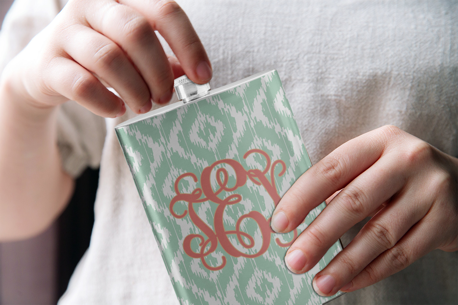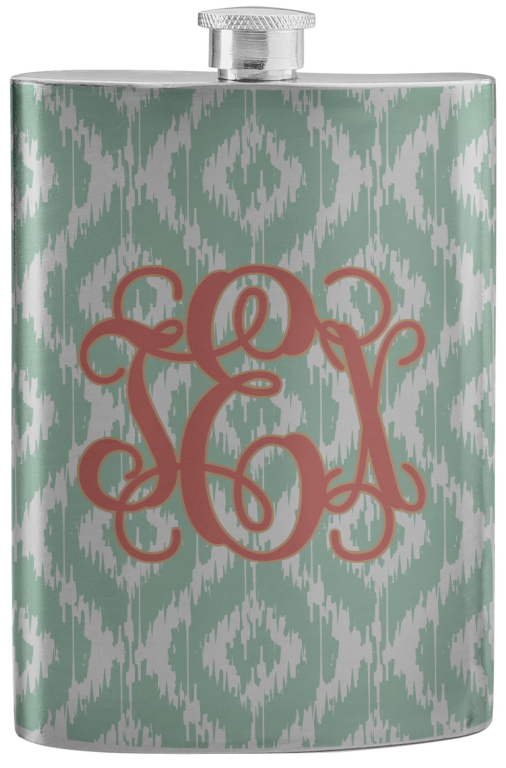 Are you a monogram-a-holic? Then, this design is perfect for you. With a subtle mint green ikat background, your monogram takes center stage in a bold coral. Let us indulge your obsession with this precious design!!