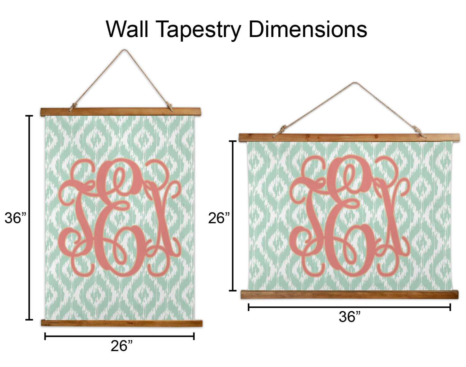 Made in two different orientations - portrait or landscape - both are 26" x 36". Your design is printed on a high quality polyester fabric with hemmed edges. The wood on the top and bottom of the tapestry is 1.25" tall and 0.25" thick and there are two pieces on top and bottom which sandwich the fabric.