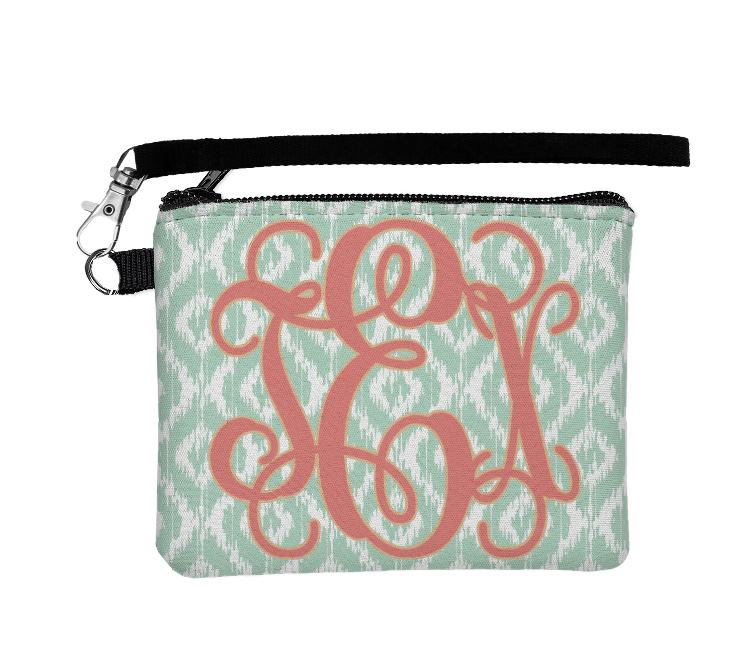 Are you a monogram-a-holic? Then, this design is perfect for you. With a subtle mint green ikat background, your monogram takes center stage in a bold coral. Let us indulge your obsession with this precious design!!