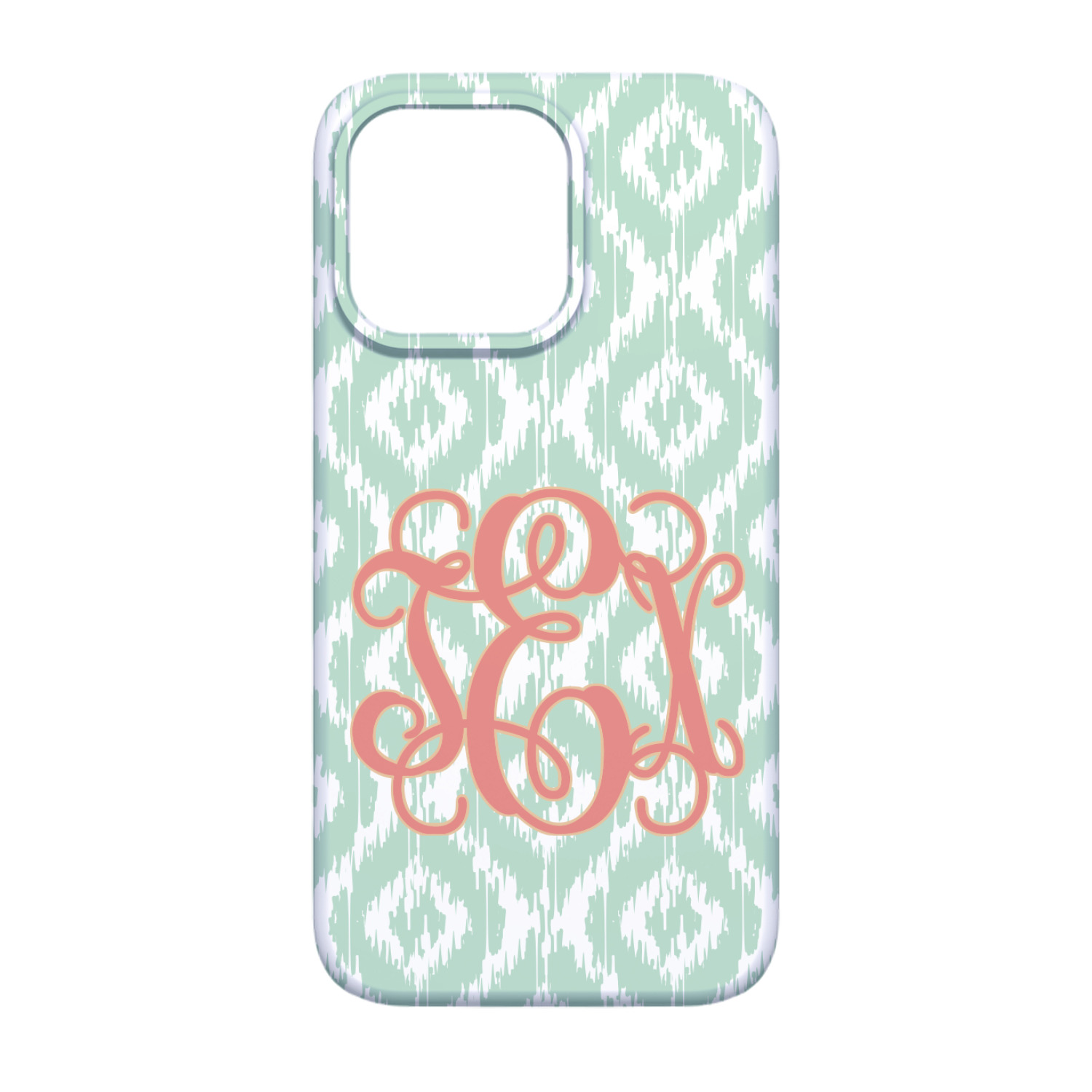Are you a monogram-a-holic? Then, this design is perfect for you. With a subtle mint green ikat background, your monogram takes center stage in a bold coral. Let us indulge your obsession with this precious design!!