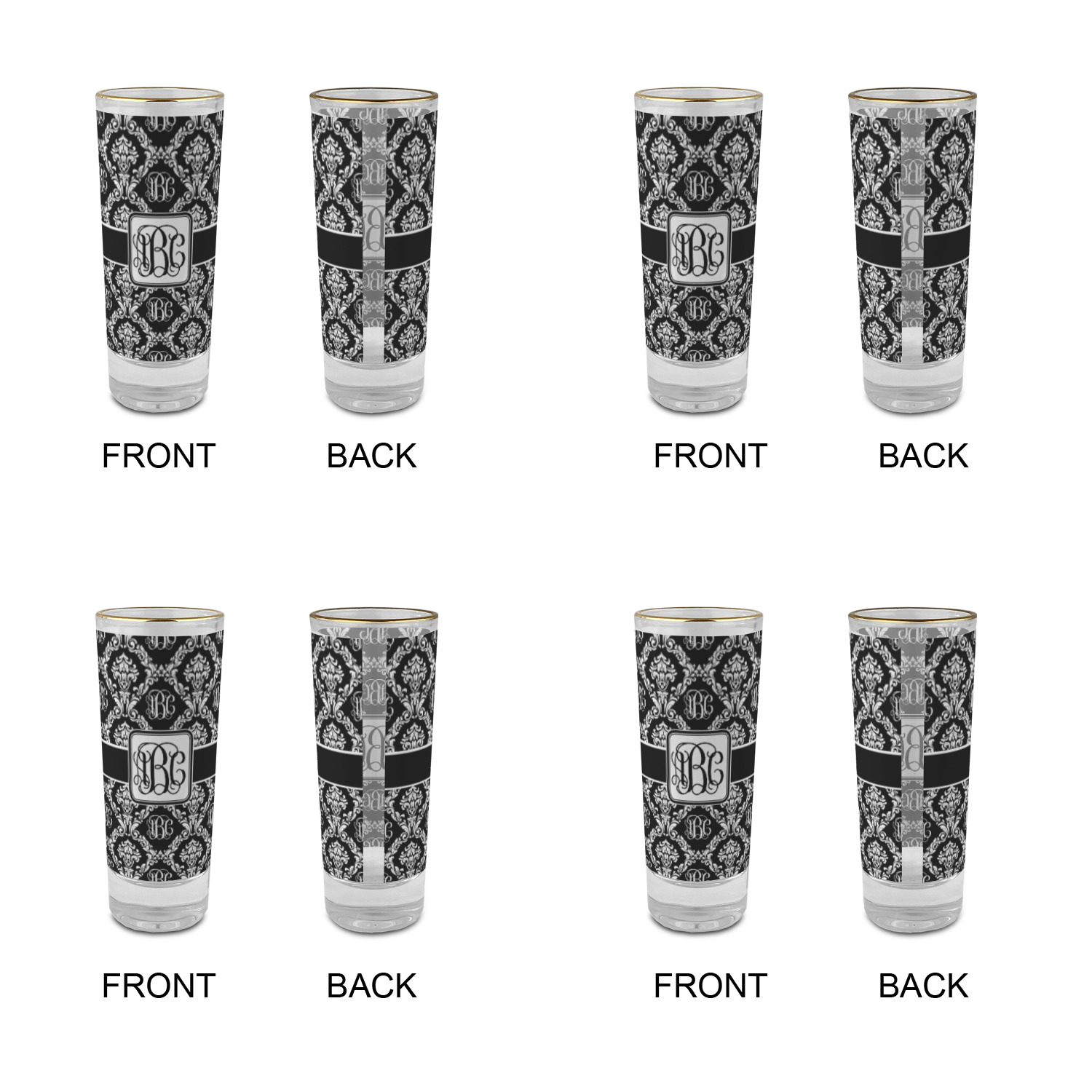 These glass shooter glasses are printed in full color with the design of your choice. These are a tall shooter 2 oz size and stand 4" tall. The print is a full wrap design to boldly display your personalization.