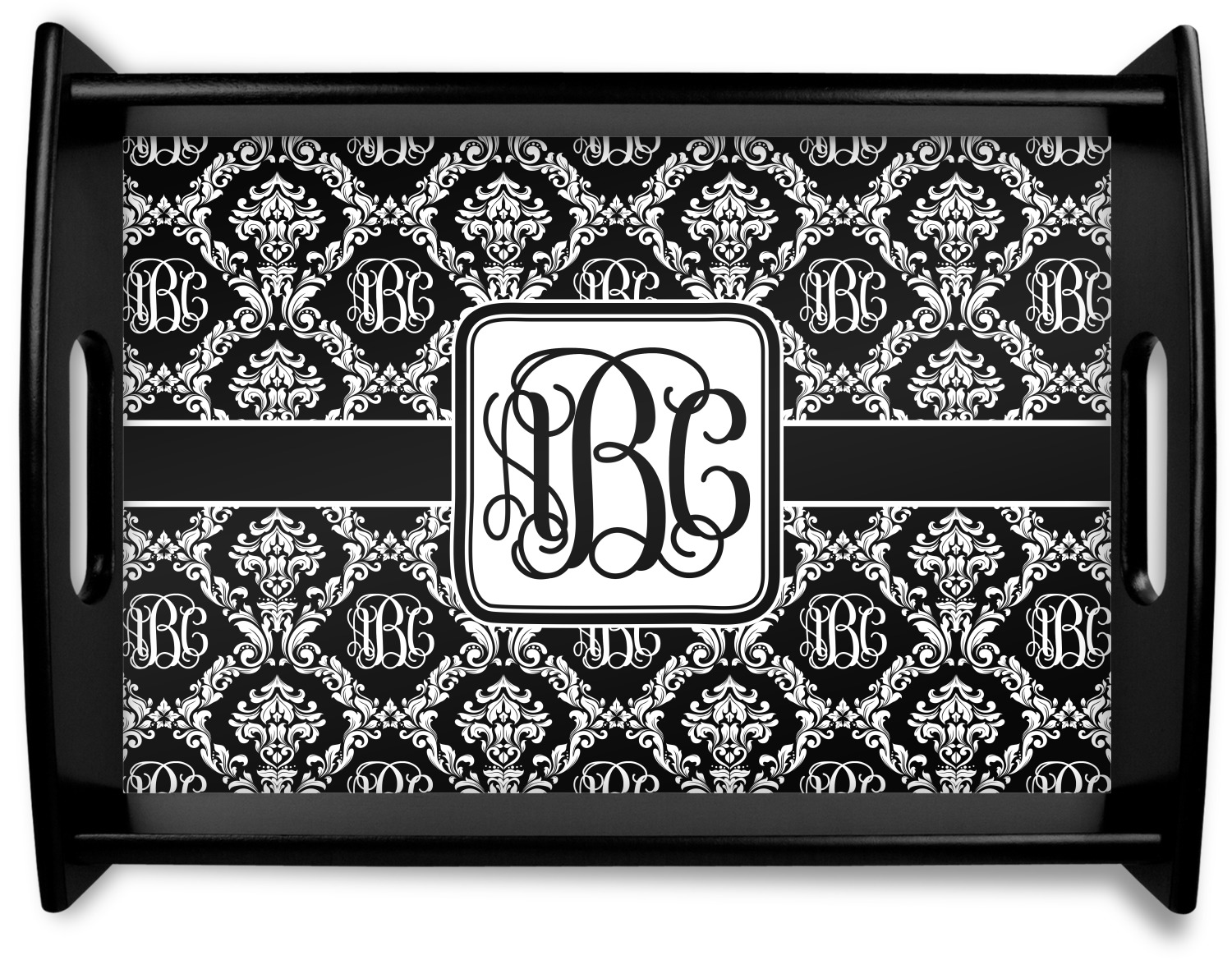 This serving tray with handles features square edges and two rounded sides, creating a very modern look. Each side is fabricated from a beautifully cut, natural wood. The bottom of the interior of the tray displays your customized design in bright, vibrant color. The tray is sold in both a black color and a natural wood look. Each variation of the wood serving tray has two sizes: Small, which is 14" x 10" x 2.25", and Large, which is 19.5" x 13.5" x 2.75".