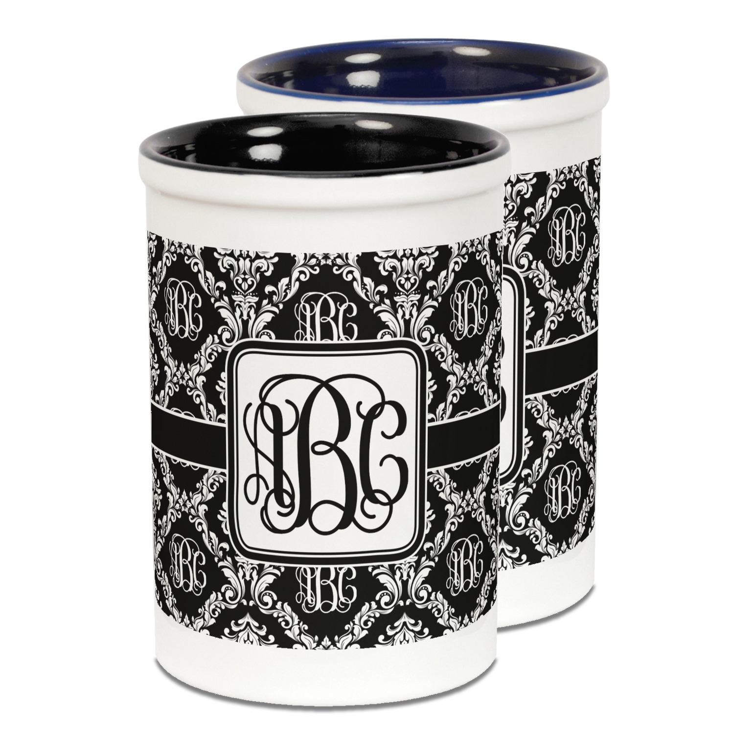 Both the blue and black pencil holders are a ceramic material, giving you a sturdy and long-lasting pen and pencil holder. We print your designs on the exterior of the pencil cup, covering most of the outside surface. There is a small white border on the top and bottom of the exterior of the pen holder, setting apart your design from the interior's color. Our ceramic pen caddy is roughly 3.5" x 3.5" x 5" in dimensions.