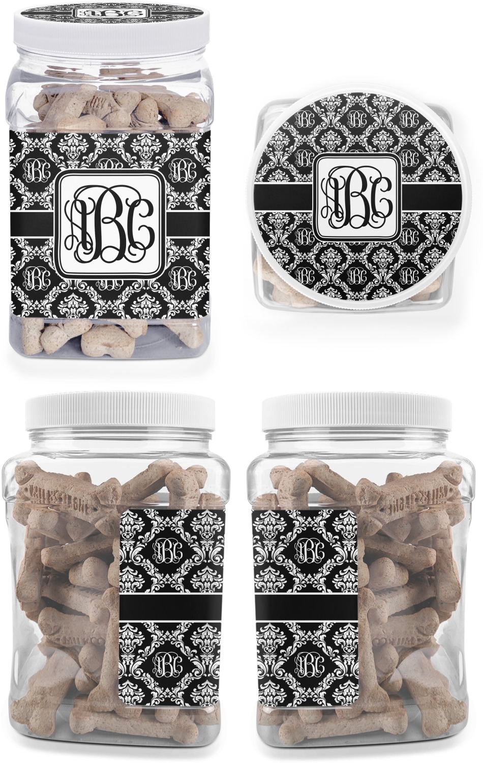 This half gallon jar, made from a sturdy plastic, is the perfect way to keep treats from any naughty pet paws, while still keeping them ready on hand for when your pup performs an impressive trick. This dog cookie jar features a screw-on, white lid that displays your personalized design on a vinyl sticker. We apply another customized sticker that wraps around the front and sides of the jar. Our dog treat jar also has indentations on the rear ends of the sides, which allows for convenient handling, and its square frame allows for easy storage.