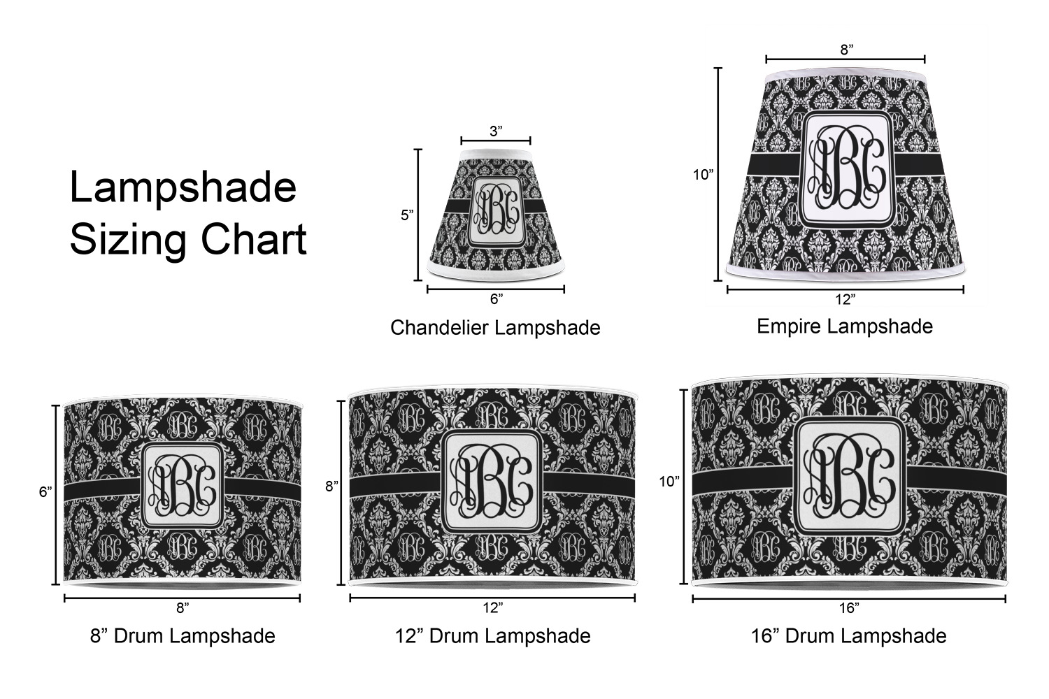 Our customized lamp shades also come in 3 different sizes: 8", 12" and 16", measuring at 8" in diameter by 6" tall, 12" in diameter by 8" tall, and 16" in diameter by 10" tall, respectively.