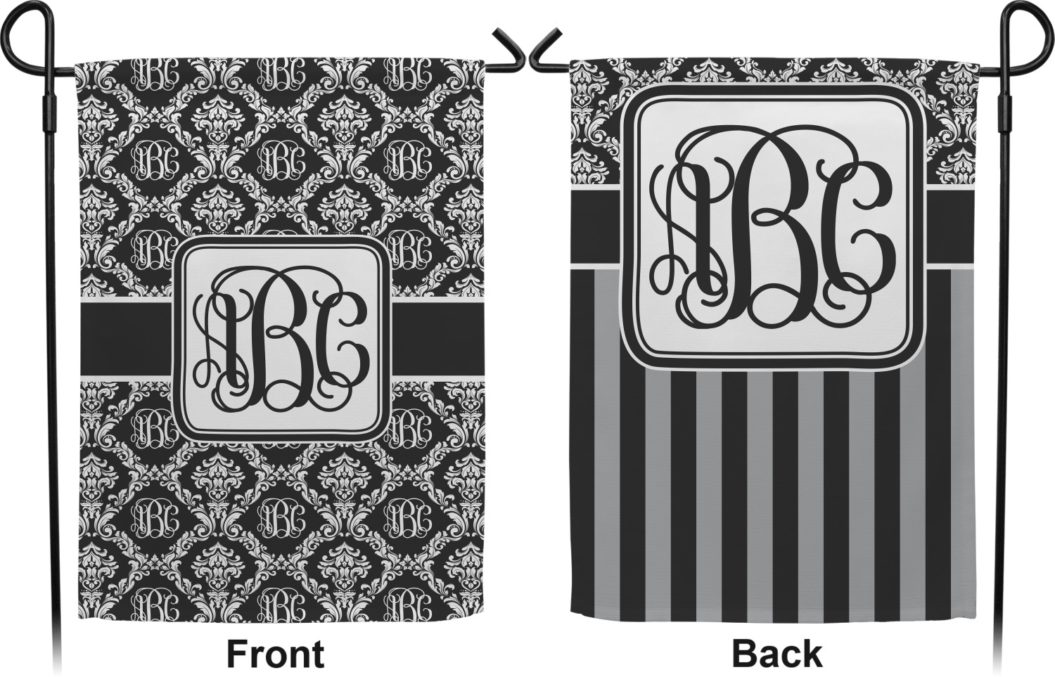 These custom garden flags are made of a durable, double-ply, polyester weave, allowing them to withstand the elements year round. The small flags measure at approximately 12 by 18 inches. The large flags measure out to 28 by 37 inches. You can order these decorative flags with your customization printed on the front only, or the front and back.