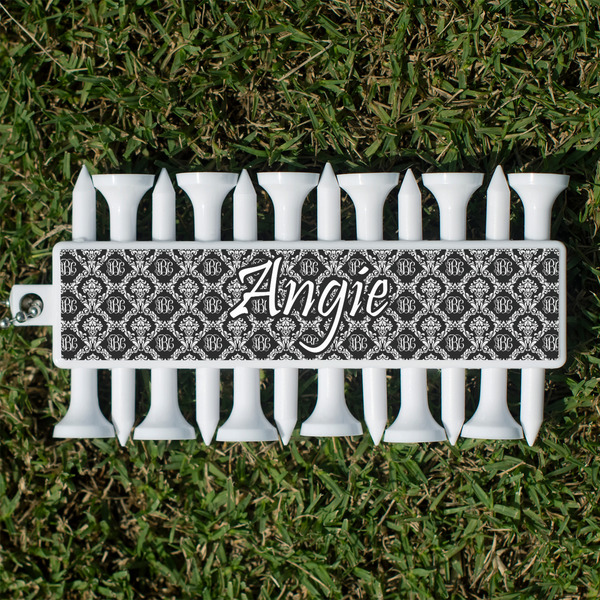 With 12 tees on a lightweight, portable key chain, it almost ensures a great 18 holes. Our tees are made of white plastic and are a little over 2". Design the front and the back of the golf tee holder. Pick from over a hundred designs, colors, and personalization styles! The set even comes with three removable ball markers as well!