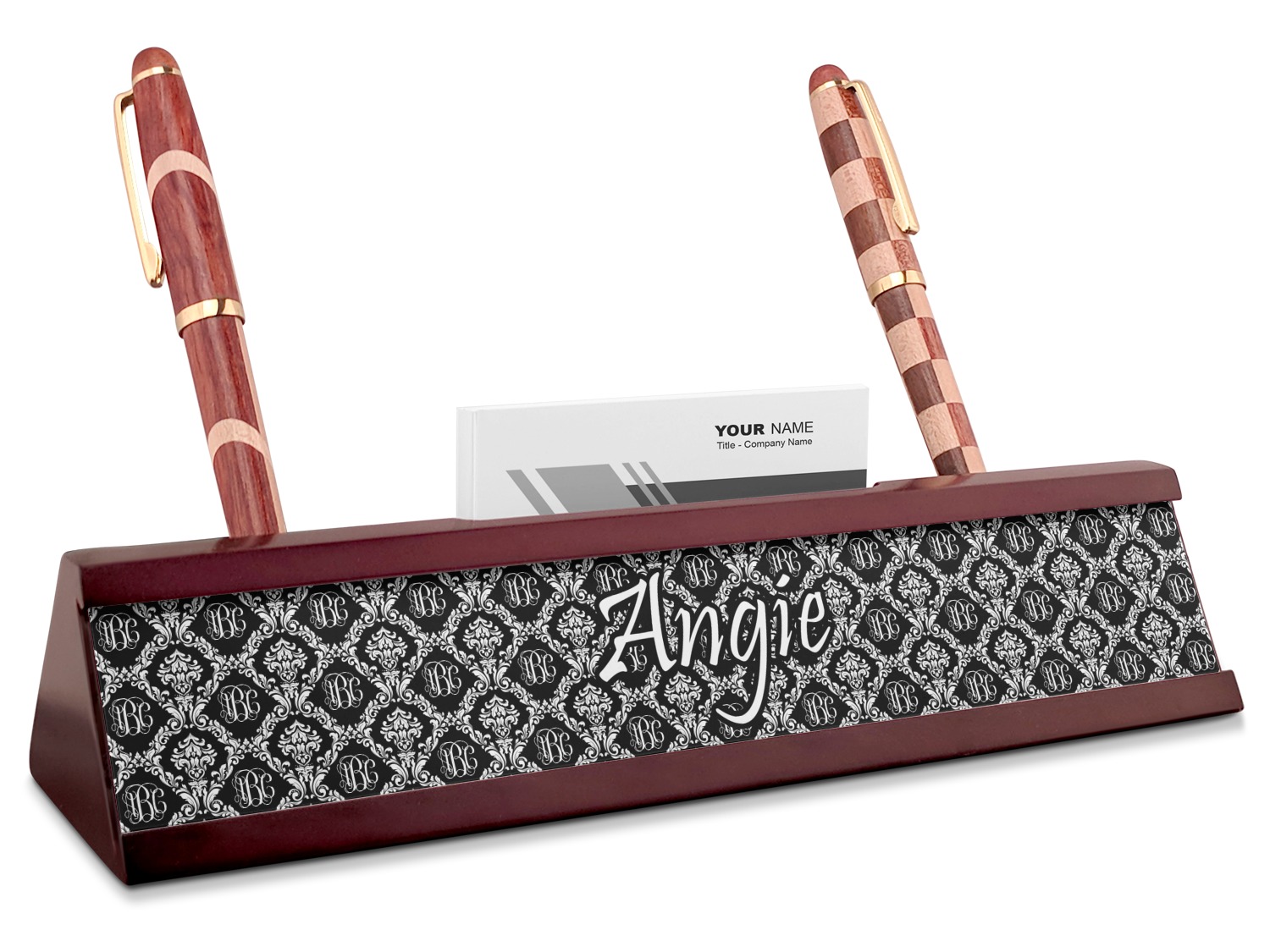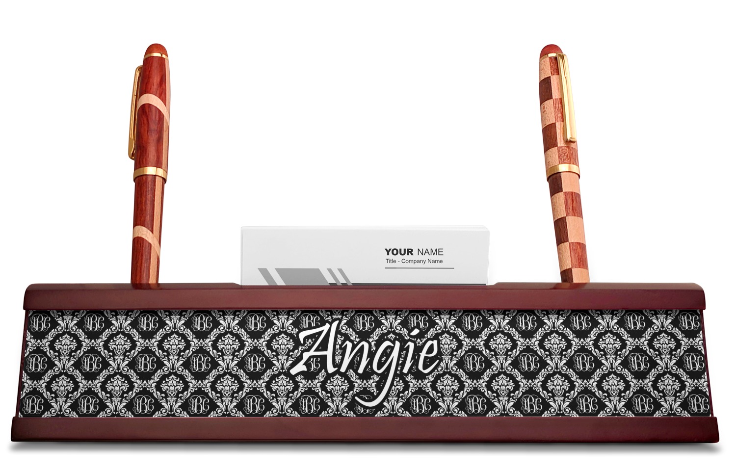 Your desk name plates are crafted from a high-quality, dark-cherry mahogany. At approximately 9.5 by 1.875 by 2.5 inches, this name plaque will fit perfectly, front and center, on your desk. Your customization spans across the entire face of the nameplate. Behind the nameplate lies a skinny slot that can fit approximately 15, traditionally-sized, business cards. You can also store your writing utensils on either side of this custom desk name plate.