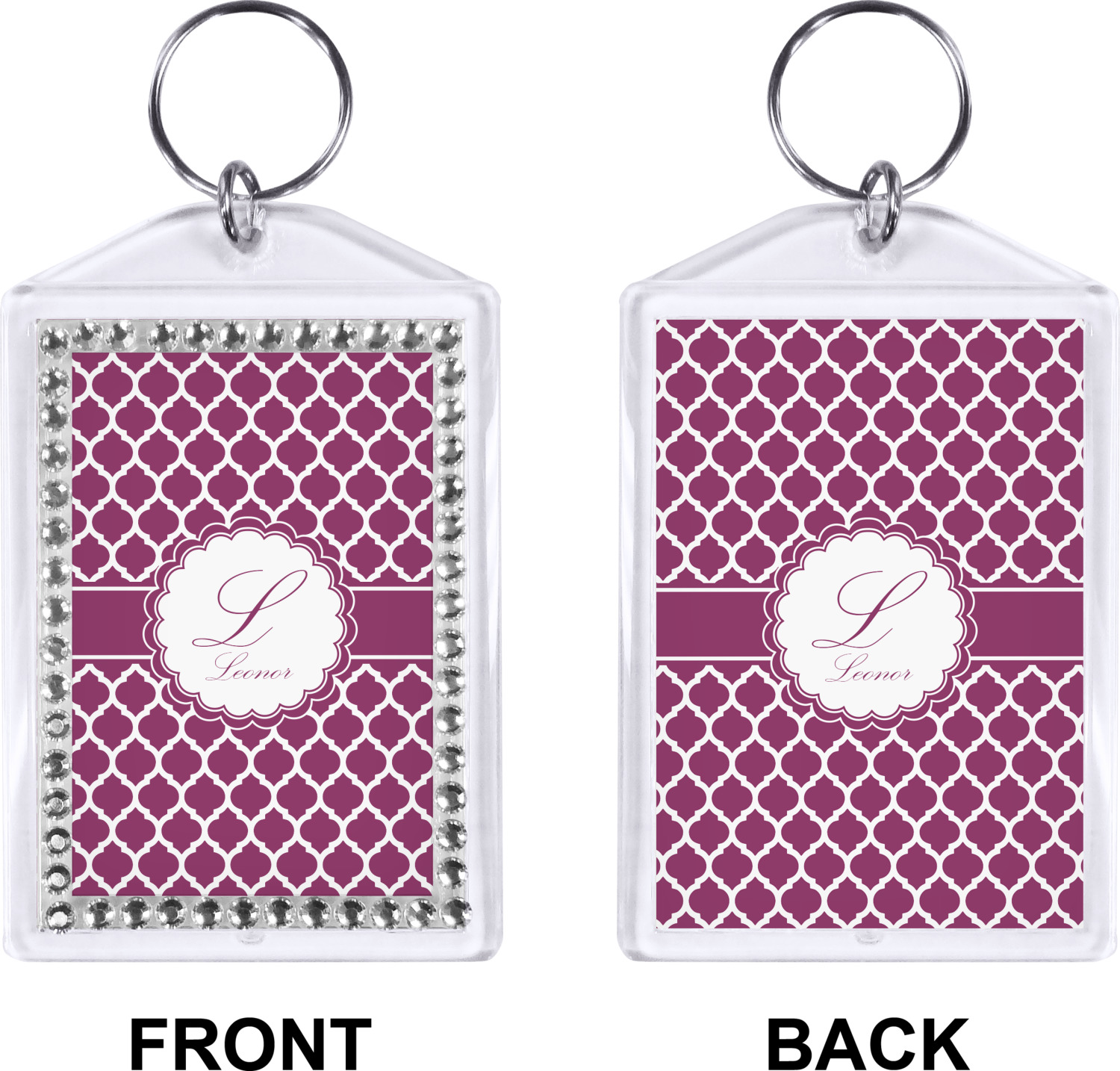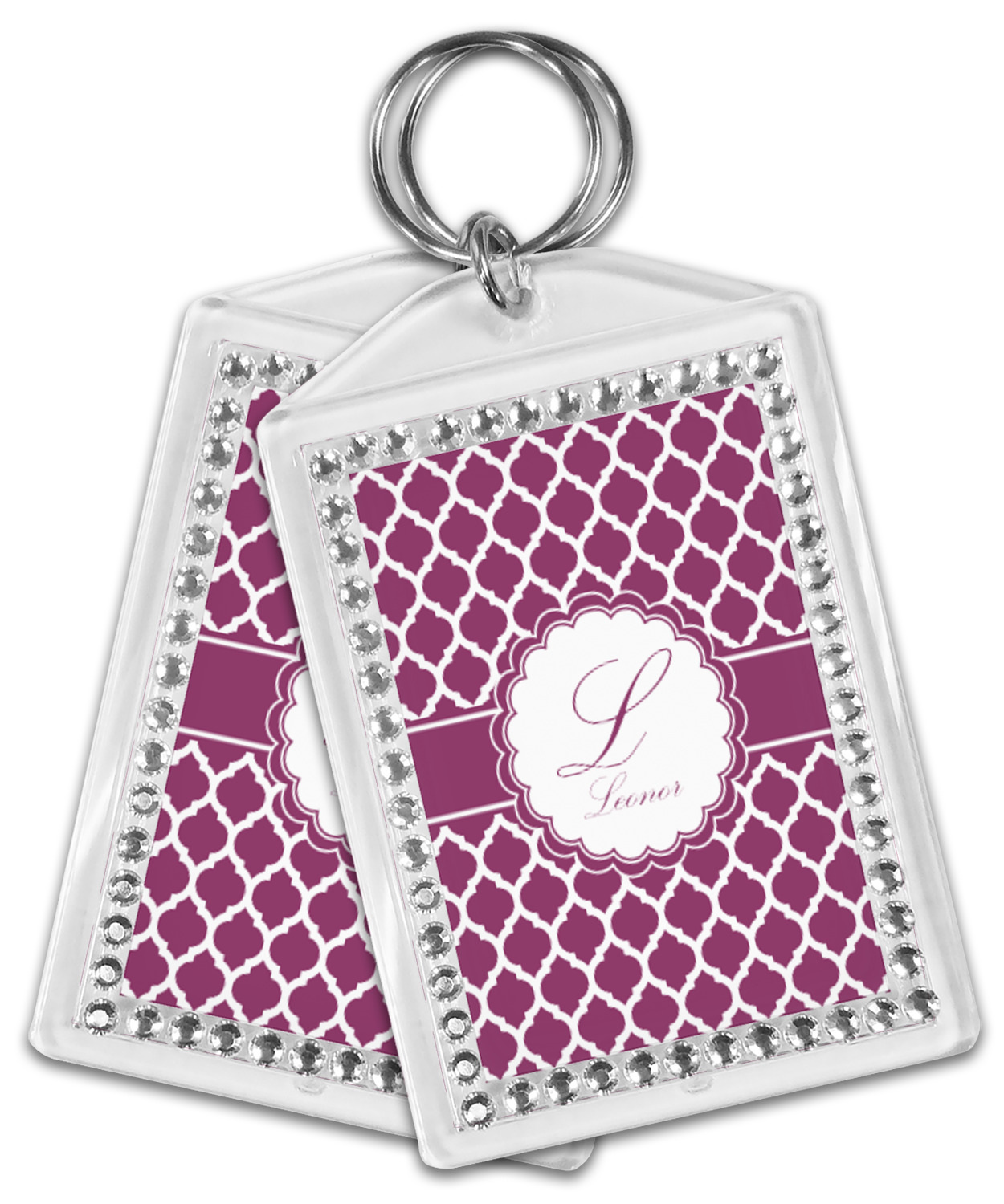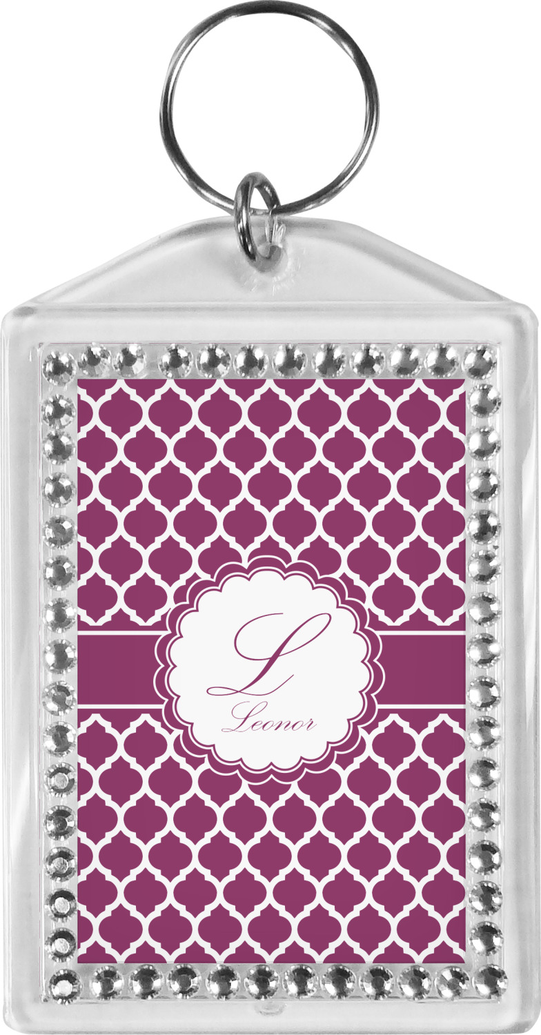 Our personalized keychains have a bold, rectangular shape, outlined by a series of shimmering rhinestones. A metal, split keyring is included with your purchase, and an additional metal hoop allows for attachment of the keychain to the split ring. This unique keychain measures at about 3.75 by 2.5 inches. We print your customized design(s) across both the back and front of this keychain.