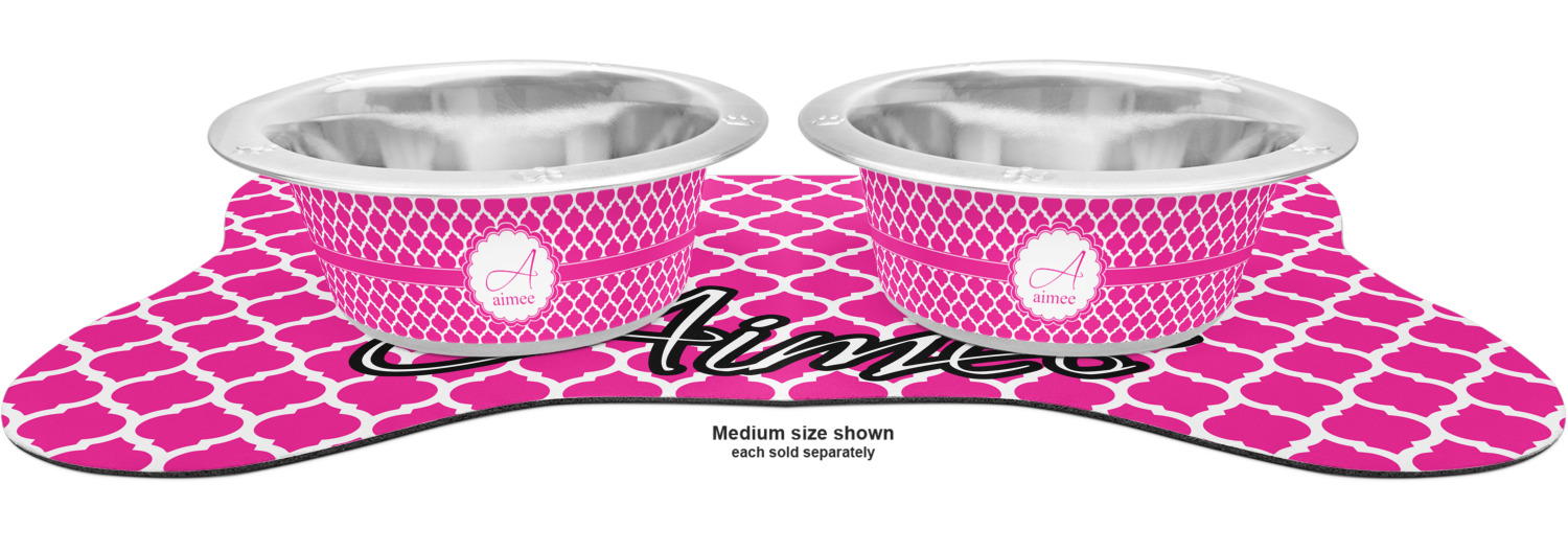 The top of this mat displays your custom design, as it is printed on polyester. To prevent slippage, the underside of the mat is made of rubber. We offer a small dog food mat, suitable for smaller dogs and a large dog food mat for bigger breeds. The small dog food mat is approximately 19 by 13 inches, while the large dog feeding mat measures at approximately 26.75 by 18 inches. Both personalized mats are ideally sized to fit two dog bowls.
