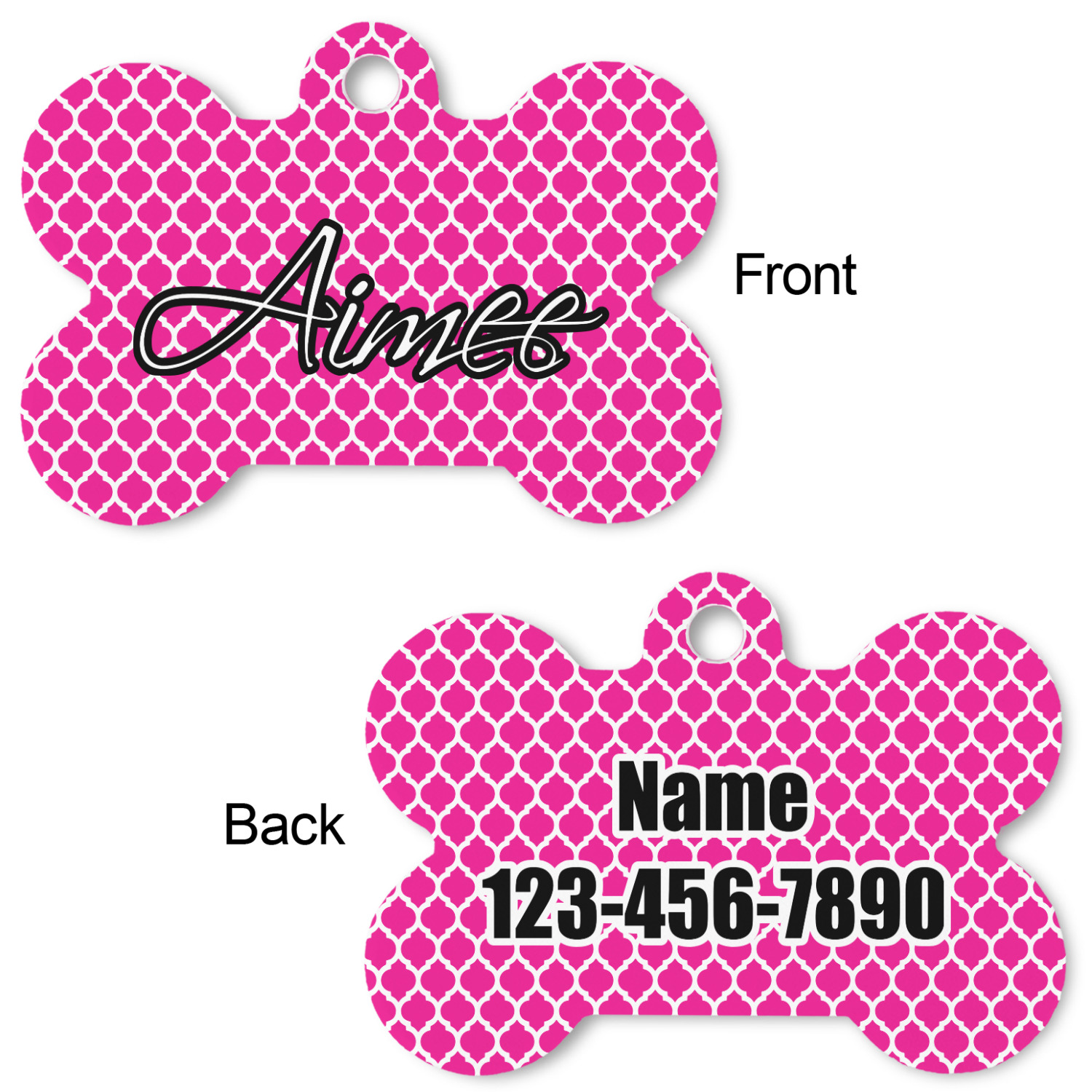 Our default design templates print your dog's personalization on the front and your contact information on the back; however everything is customizable, so you customize the patterns, the colors, the personalization, the contact information etc.