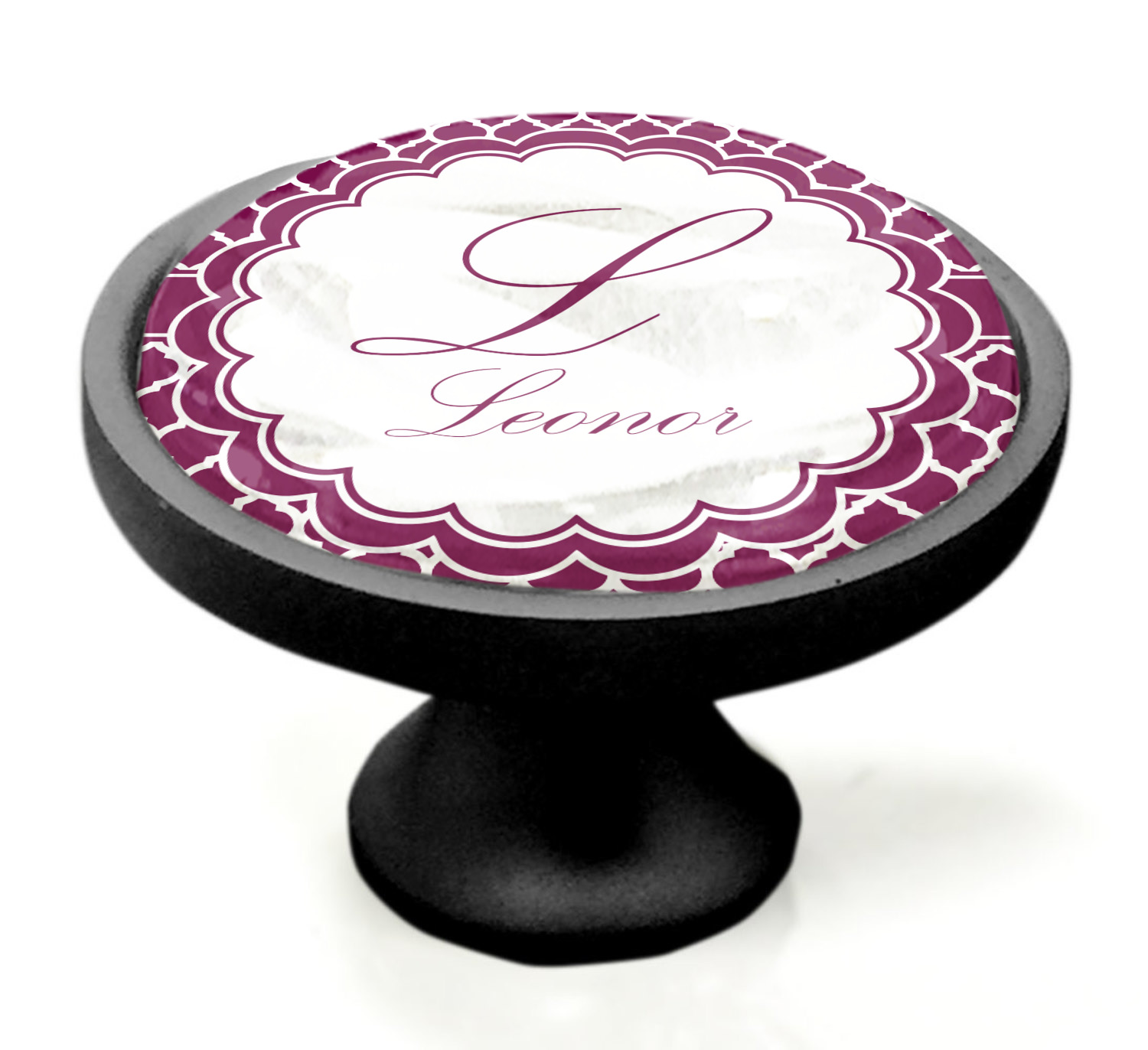 We sell these cabinet pulls in two different colors to better match your room's color scheme. We offer an oil-rubbed bronze base that is black in color, and a satin nickel option, which has a silver color. Your design is displayed across a high gloss vinyl insert that is placed on top of these cabinet handles. We then place a 1 inch thick glass cabochon atop the design, which seals the cabinet knob and makes the colors of your customization stand out. These custom cabinet knobs are approximately 1.3 inches in diameter. Your purchase includes a 1 inch screw that can be used to mount the knob to any cabinet in your home.