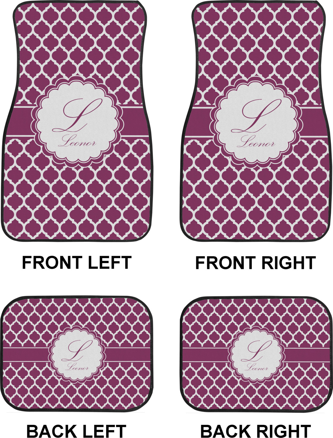We craft our auto floor mats mats from polyester, apply a black finish to the edges, and lined at the bottom to prevent slippage. These mats protect your floors from grass, mud, and any accidental spills. We display your personalized design on the front face of each mat. The sizes of these car floor liners are standardized to provide a versatile fit for all vehicles. The front rows car mats measure at 17 by 26.5 inches, while the back rows measure at 17 by 13 inches. We sell three packages of car floor mats. You can purchase a pair of front row car mats, a pair of back row car mats, or a set of front row and back row car mats. To make an informed purchase, we recommend measuring the surface area of your car floors.