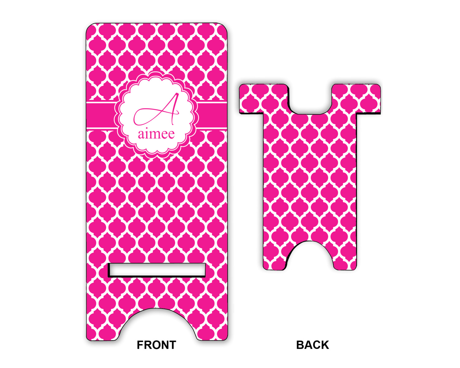 To meet your needs, we offer four variations of this IPhone stand. The backboard of the first version is shaped as a plain, yet sleek rectangle, and is available in two sizes. Our smaller size is approximately 4 by 3.25 by 7 inches, while the larger model is 4 by 3.77 by 8.5 inches. Alongside this model, we also provide you with a more decorative option. The upper part of our second version features a curved edge, for a classy, suave appearance. This phone holder is also sold in two sizes: a smaller version, which is 4 by 3.25 by 7 inches, and our larger model, which is 4 by 3.77 by 8.5 inches. Both models will support large phones, but the larger model is better if you wish to proudly display your personalized design.