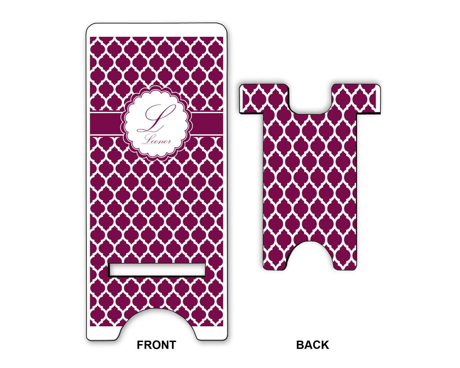 To meet your needs, we offer four variations of this IPhone stand. The backboard of the first version is shaped as a plain, yet sleek rectangle, and is available in two sizes. Our smaller size is approximately 4 by 3.25 by 7 inches, while the larger model is 4 by 3.77 by 8.5 inches. Alongside this model, we also provide you with a more decorative option. The upper part of our second version features a curved edge, for a classy, suave appearance. This phone holder is also sold in two sizes: a smaller version, which is 4 by 3.25 by 7 inches, and our larger model, which is 4 by 3.77 by 8.5 inches. Both models will support large phones, but the larger model is better if you wish to proudly display your personalized design.