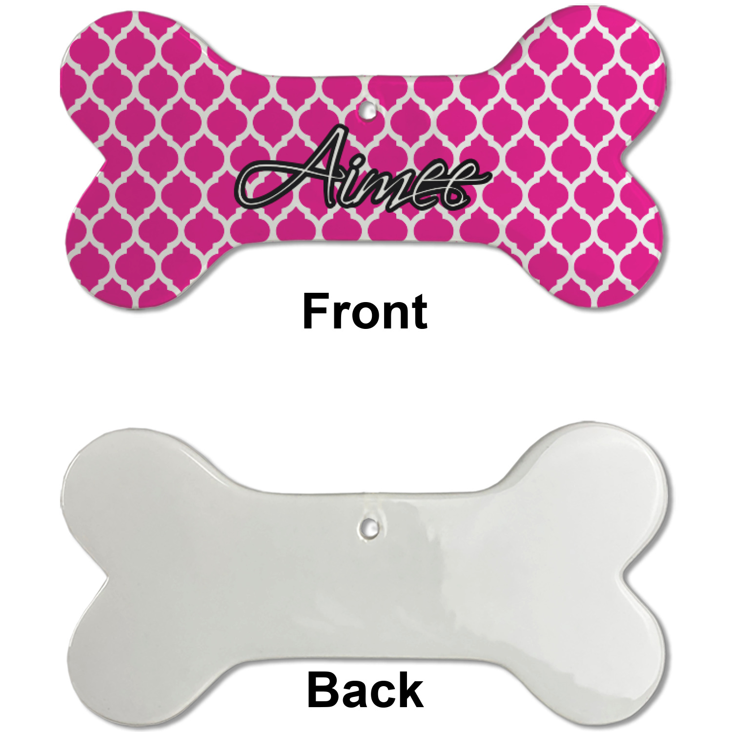 Our dog Christmas ornaments are a ceramic material with a bone-shaped structure hung horizontally. We offer two printing styles to personalize your furry friend's ornament! Choose a one-sided printing, perfect for wall decor, memorial accessory, or doghouse nameplate! Create a double-sided ornament perfect for adorning the Christmas tree. Each dog bone ornament is approximately 4.75" x 2.25" and is printed here in the USA.