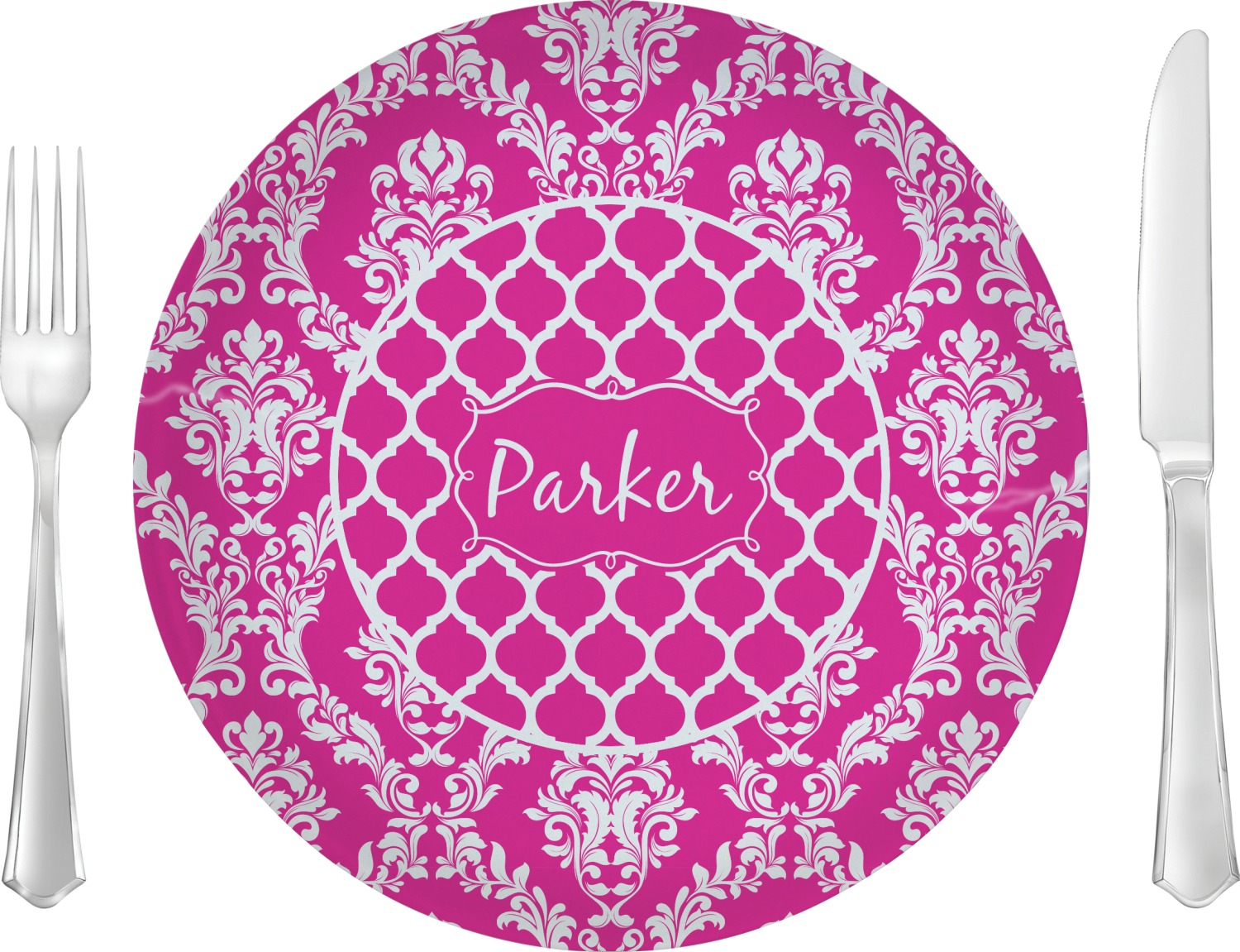 This is one of our new concentric design style - where you can use any two patterns together - we have chose to feature our damask and moroccan / trellis patterns. We chose our hot pink and white for our colors and curlz label with a name for personalization.