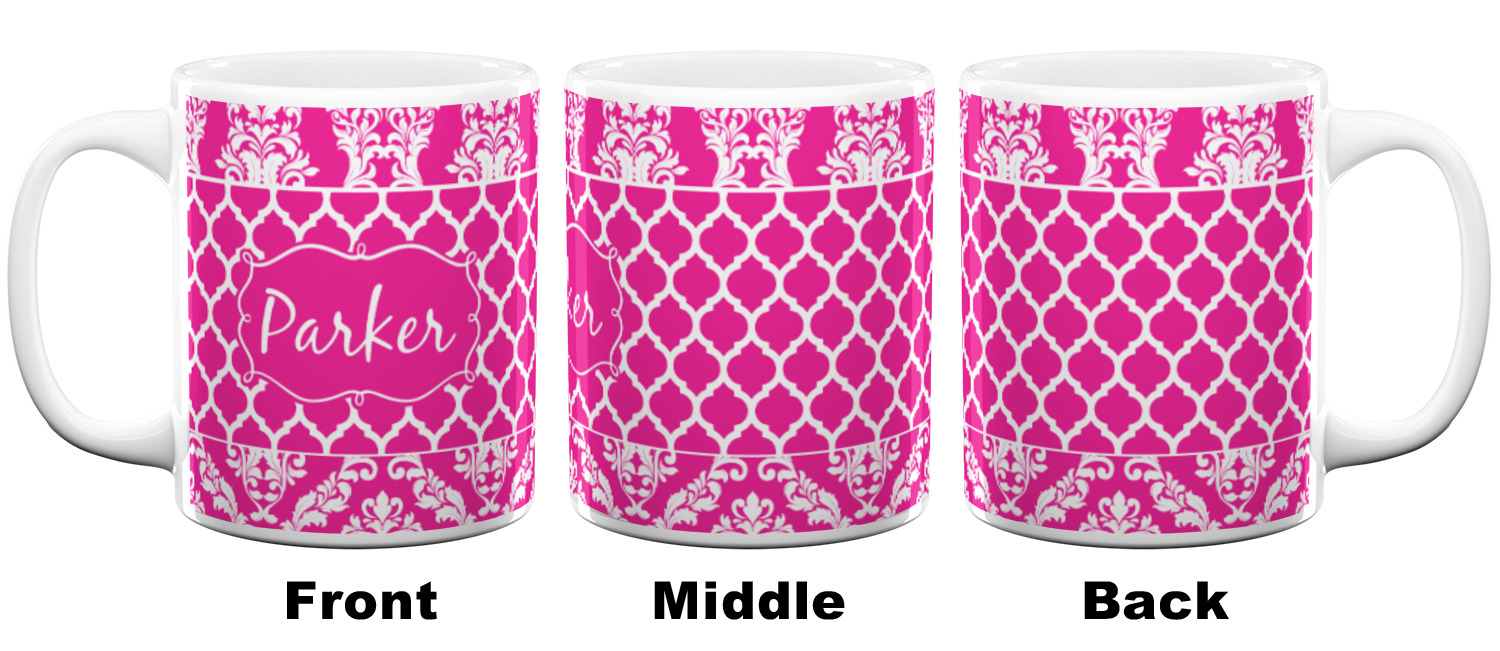 This is one of our new concentric design style - where you can use any two patterns together - we have chose to feature our damask and moroccan / trellis patterns. We chose our hot pink and white for our colors and curlz label with a name for personalization.