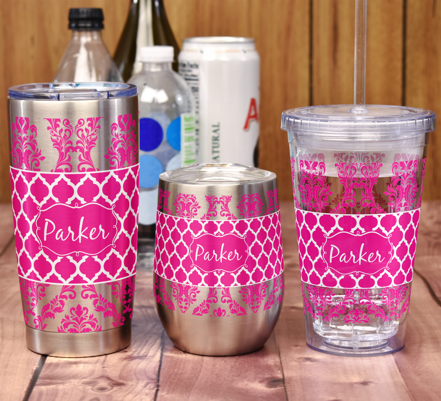 This is one of our new concentric design style - where you can use any two patterns together - we have chose to feature our damask and moroccan / trellis patterns. We chose our hot pink and white for our colors and curlz label with a name for personalization.