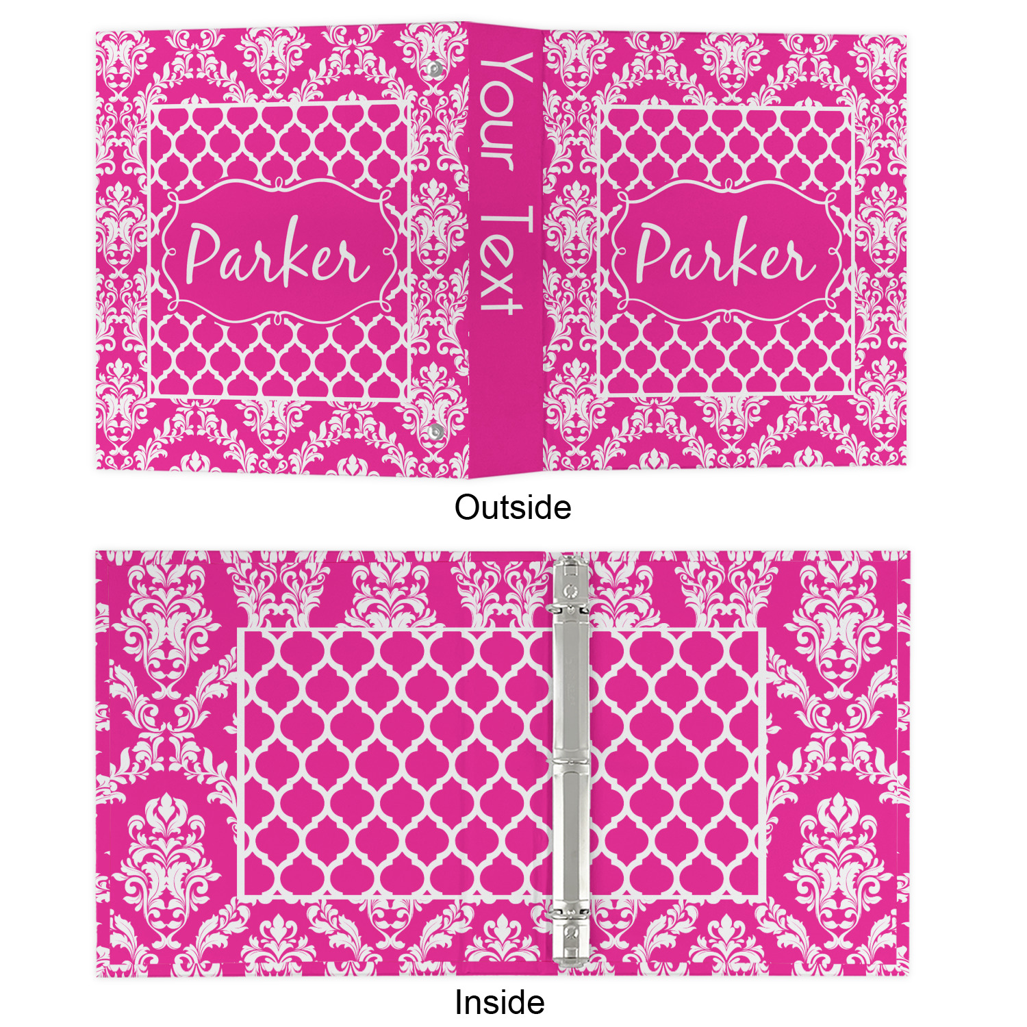 This is one of our new concentric design style - where you can use any two patterns together - we have chose to feature our damask and moroccan / trellis patterns. We chose our hot pink and white for our colors and curlz label with a name for personalization.