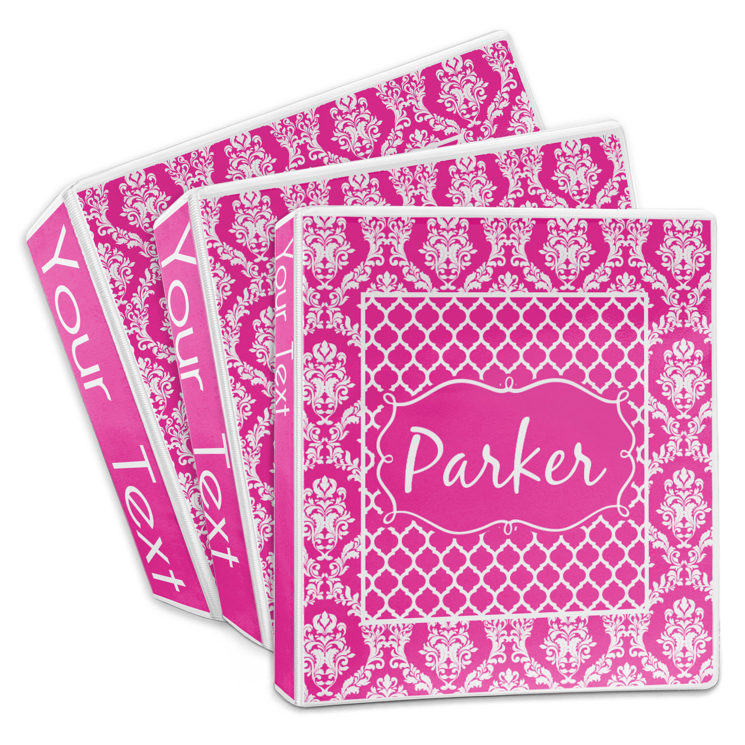 This is one of our new concentric design style - where you can use any two patterns together - we have chose to feature our damask and moroccan / trellis patterns. We chose our hot pink and white for our colors and curlz label with a name for personalization.