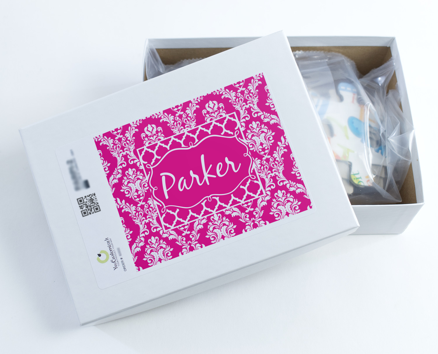This is one of our new concentric design style - where you can use any two patterns together - we have chose to feature our damask and moroccan / trellis patterns. We chose our hot pink and white for our colors and curlz label with a name for personalization.