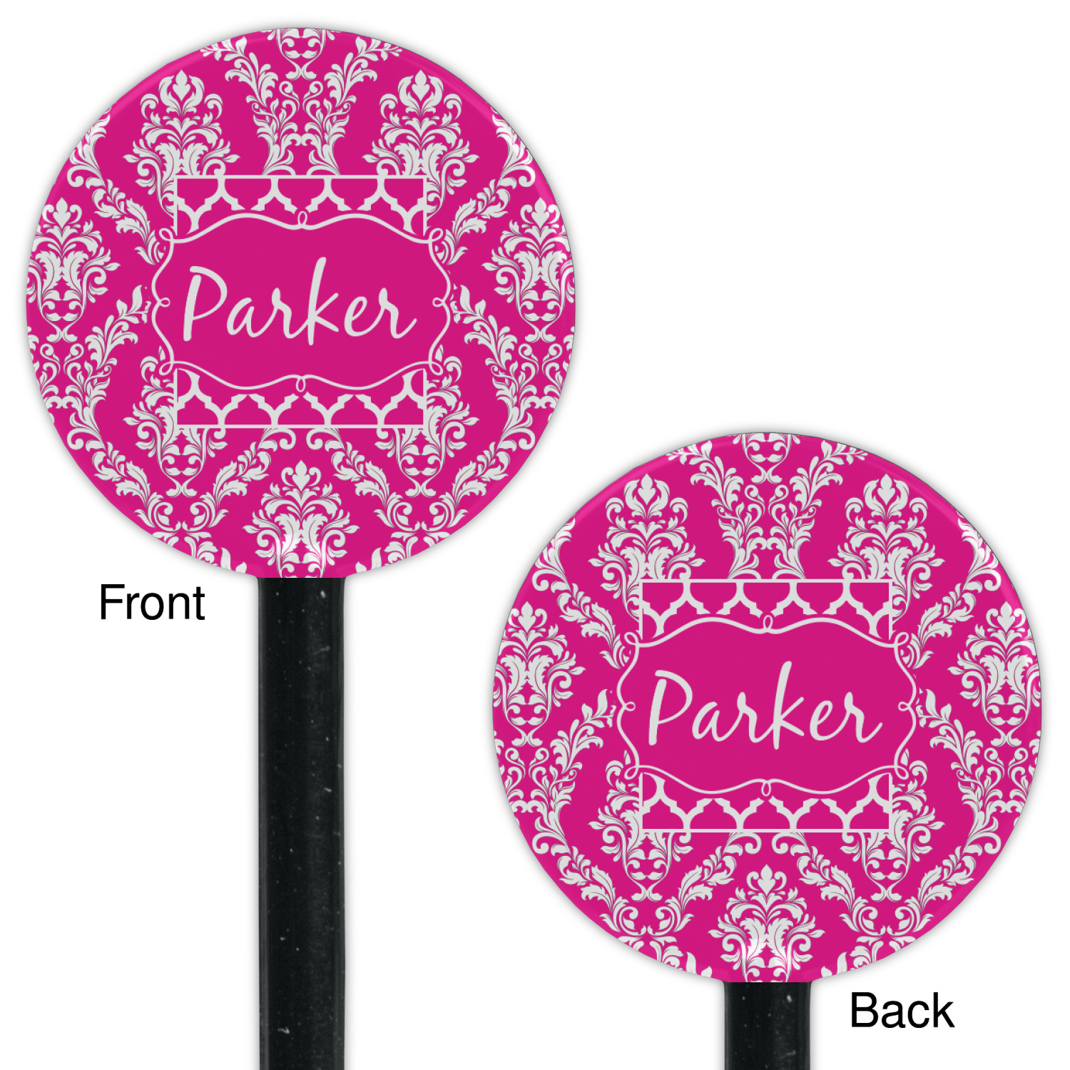 This is one of our new concentric design style - where you can use any two patterns together - we have chose to feature our damask and moroccan / trellis patterns. We chose our hot pink and white for our colors and curlz label with a name for personalization.