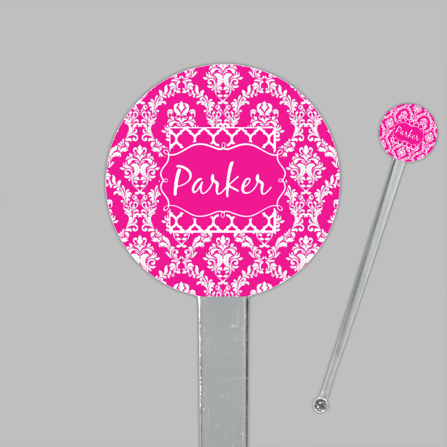 This is one of our new concentric design style - where you can use any two patterns together - we have chose to feature our damask and moroccan / trellis patterns. We chose our hot pink and white for our colors and curlz label with a name for personalization.