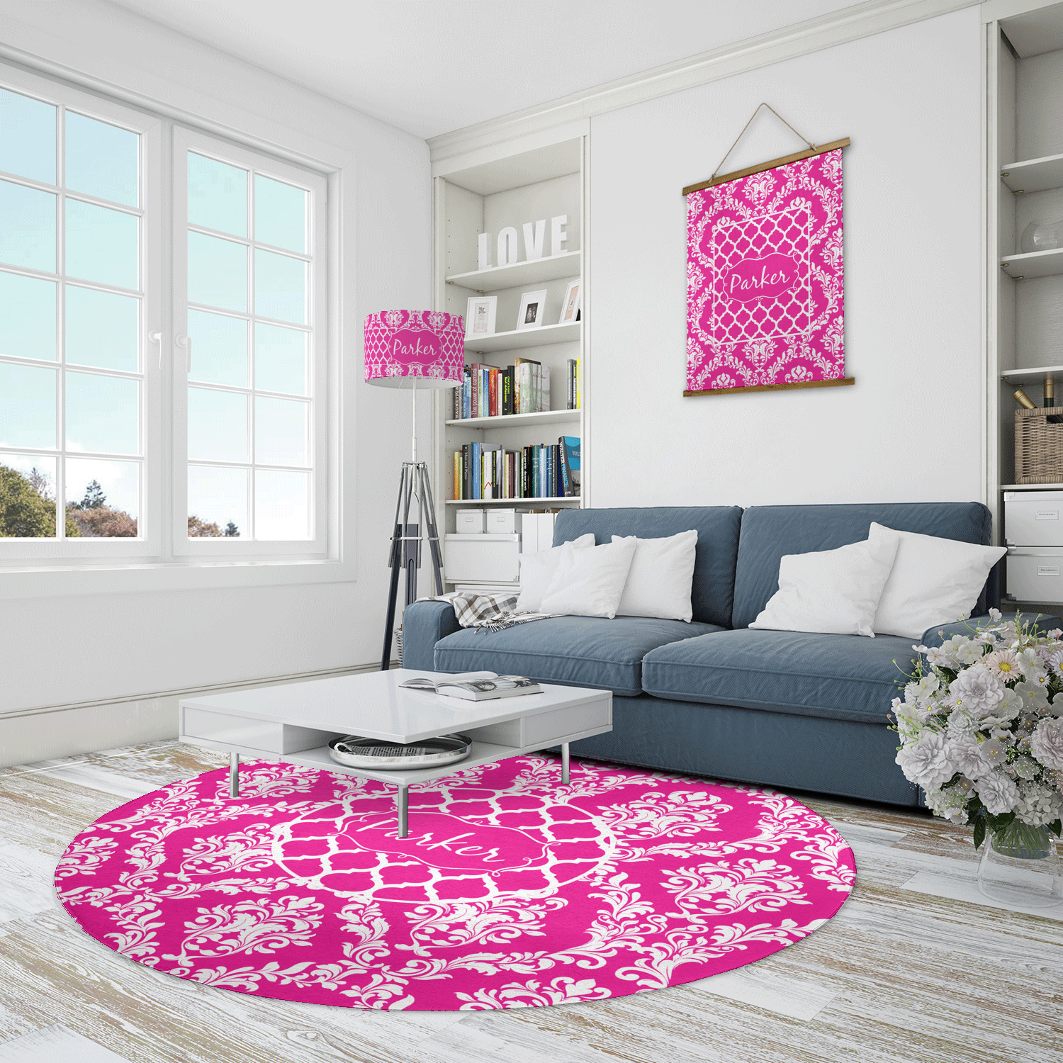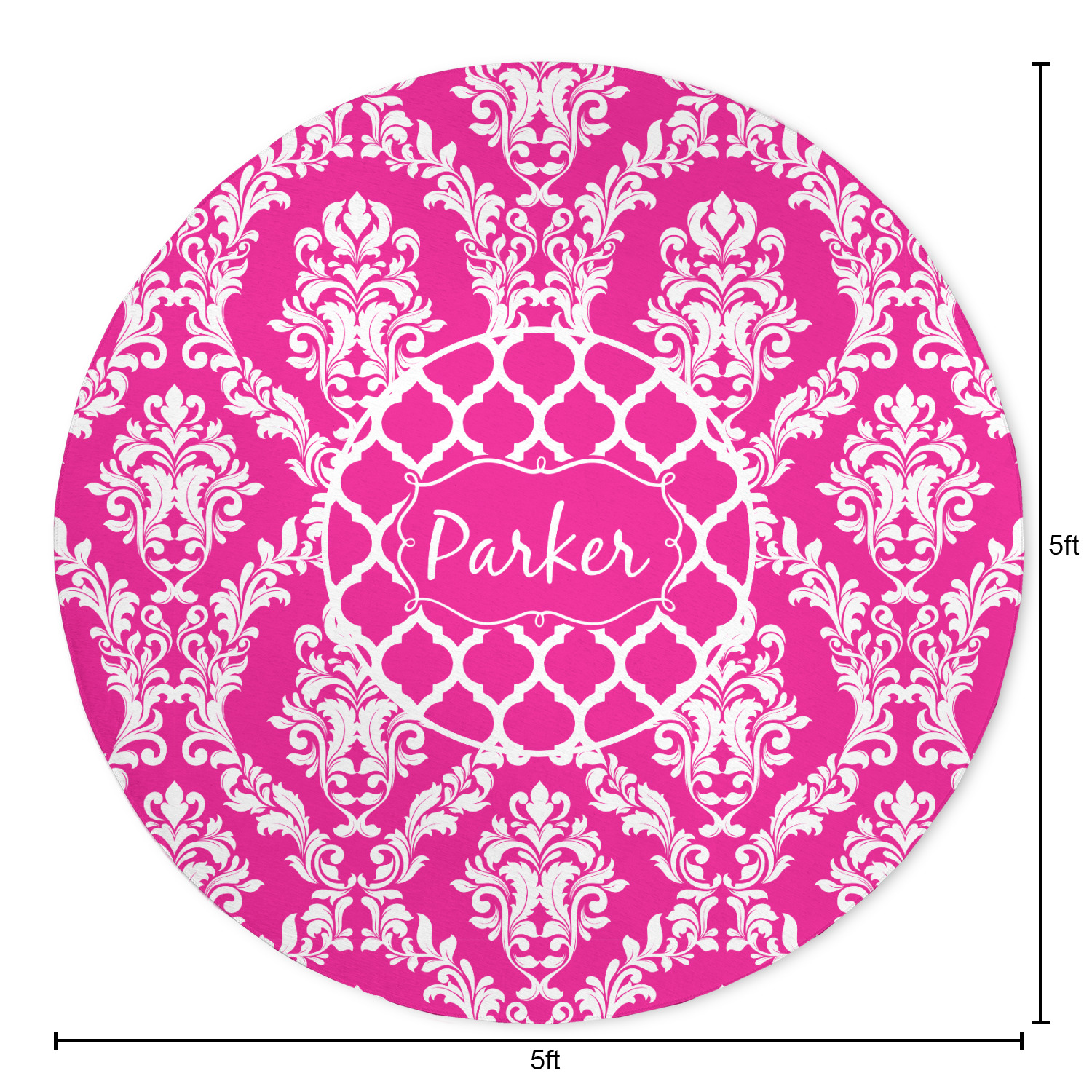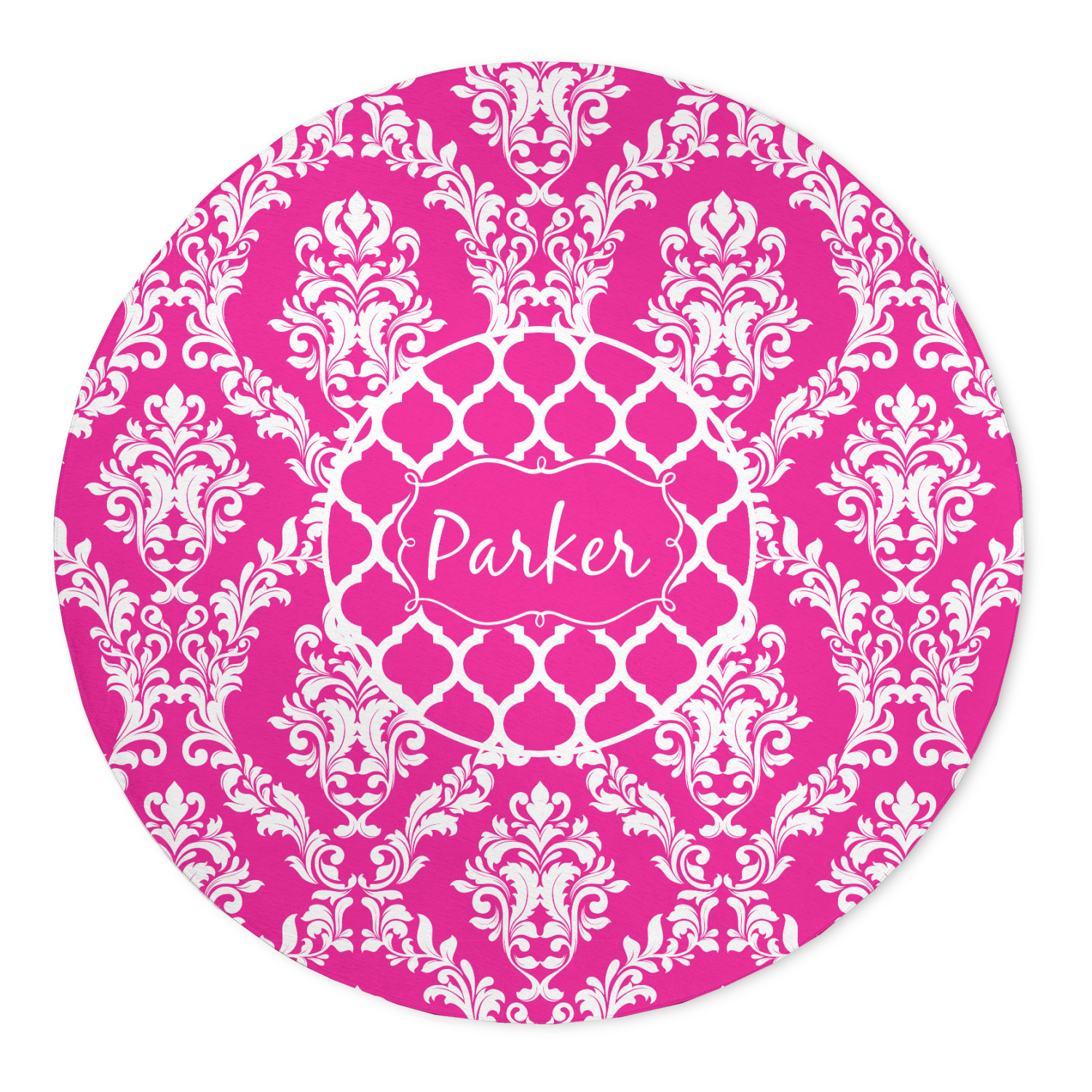 This is one of our new concentric design style - where you can use any two patterns together - we have chose to feature our damask and moroccan / trellis patterns. We chose our hot pink and white for our colors and curlz label with a name for personalization.