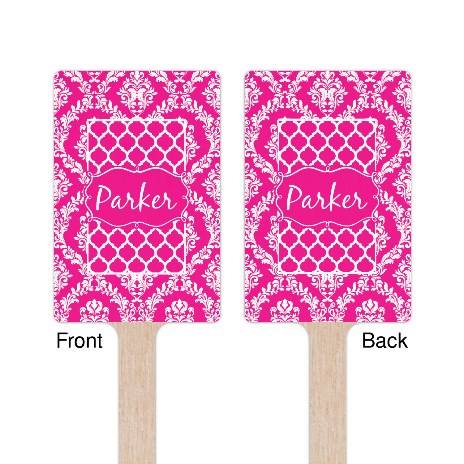 This is one of our new concentric design style - where you can use any two patterns together - we have chose to feature our damask and moroccan / trellis patterns. We chose our hot pink and white for our colors and curlz label with a name for personalization.