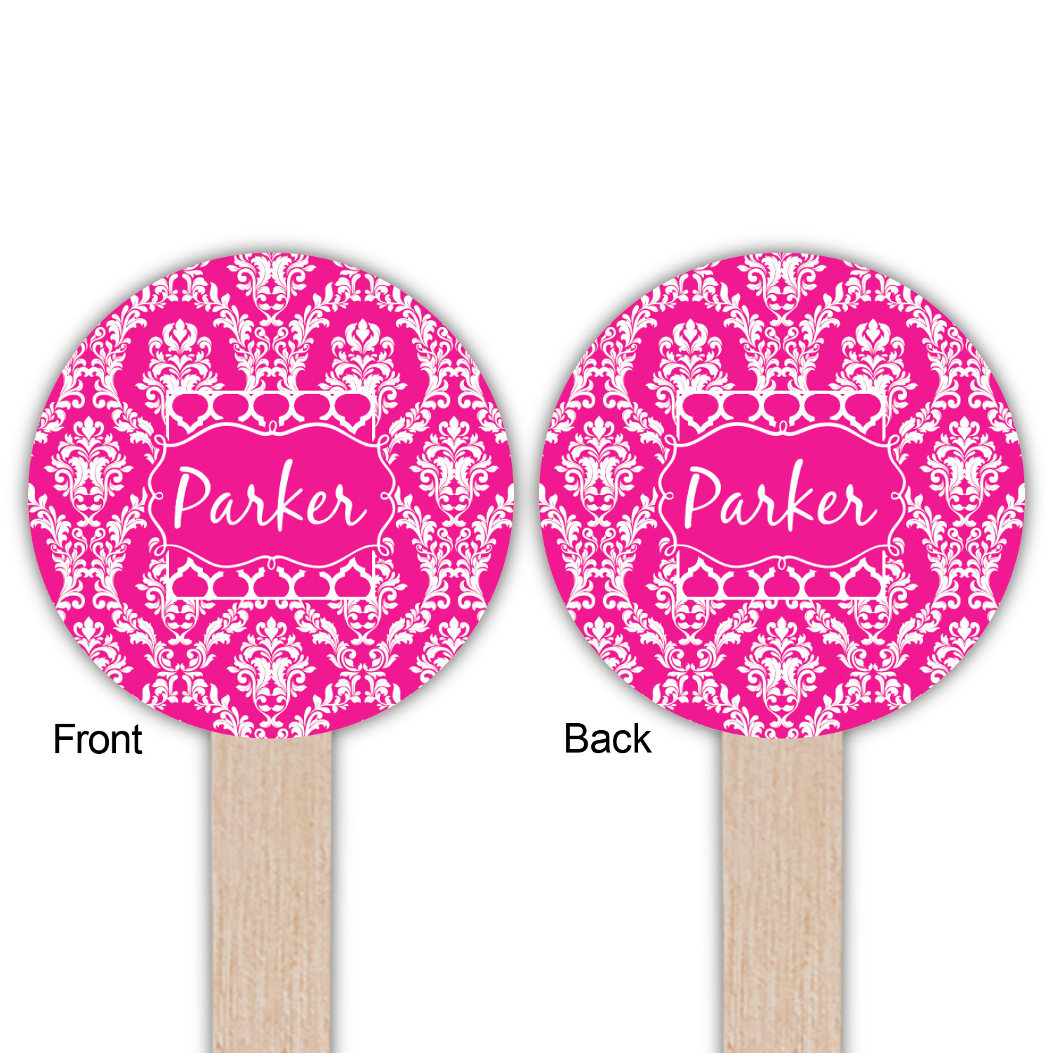 This is one of our new concentric design style - where you can use any two patterns together - we have chose to feature our damask and moroccan / trellis patterns. We chose our hot pink and white for our colors and curlz label with a name for personalization.