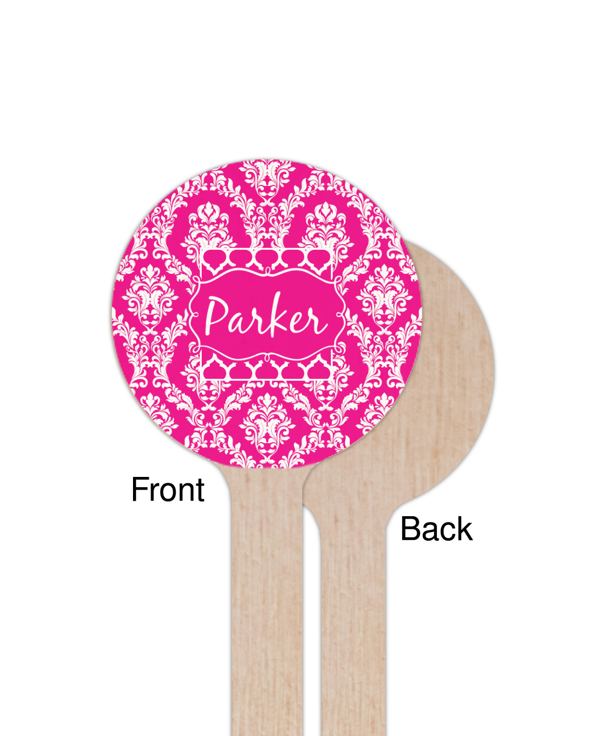 This is one of our new concentric design style - where you can use any two patterns together - we have chose to feature our damask and moroccan / trellis patterns. We chose our hot pink and white for our colors and curlz label with a name for personalization.