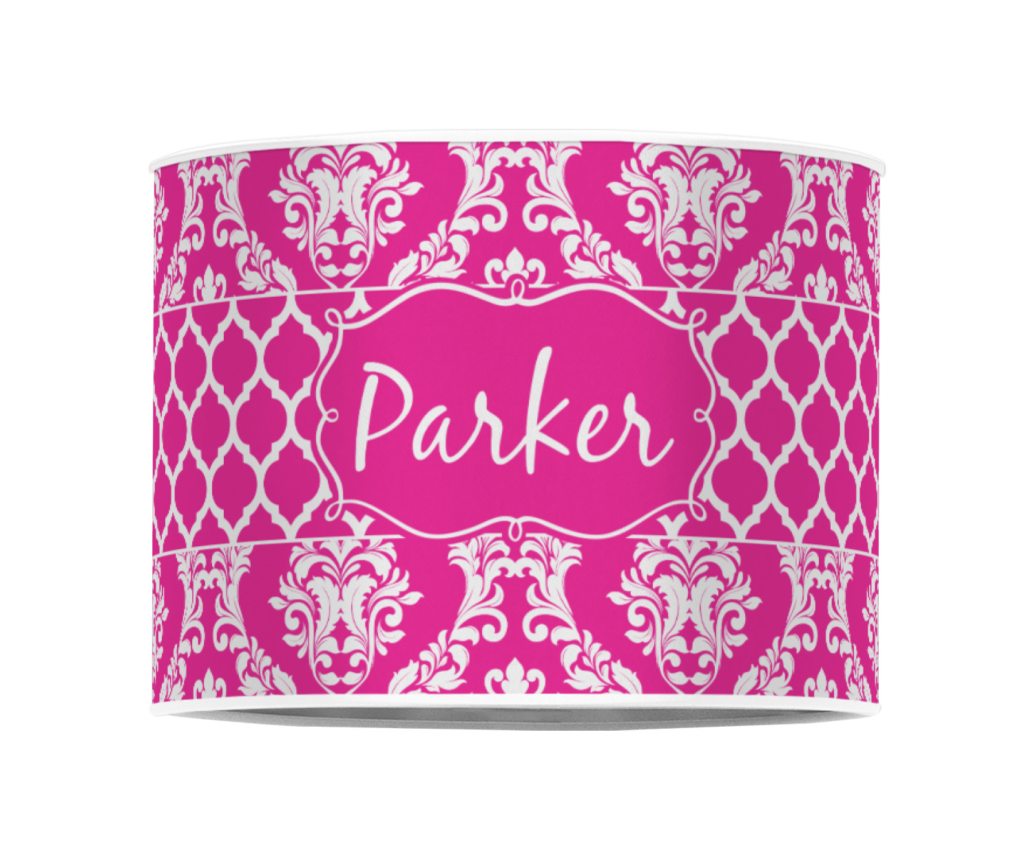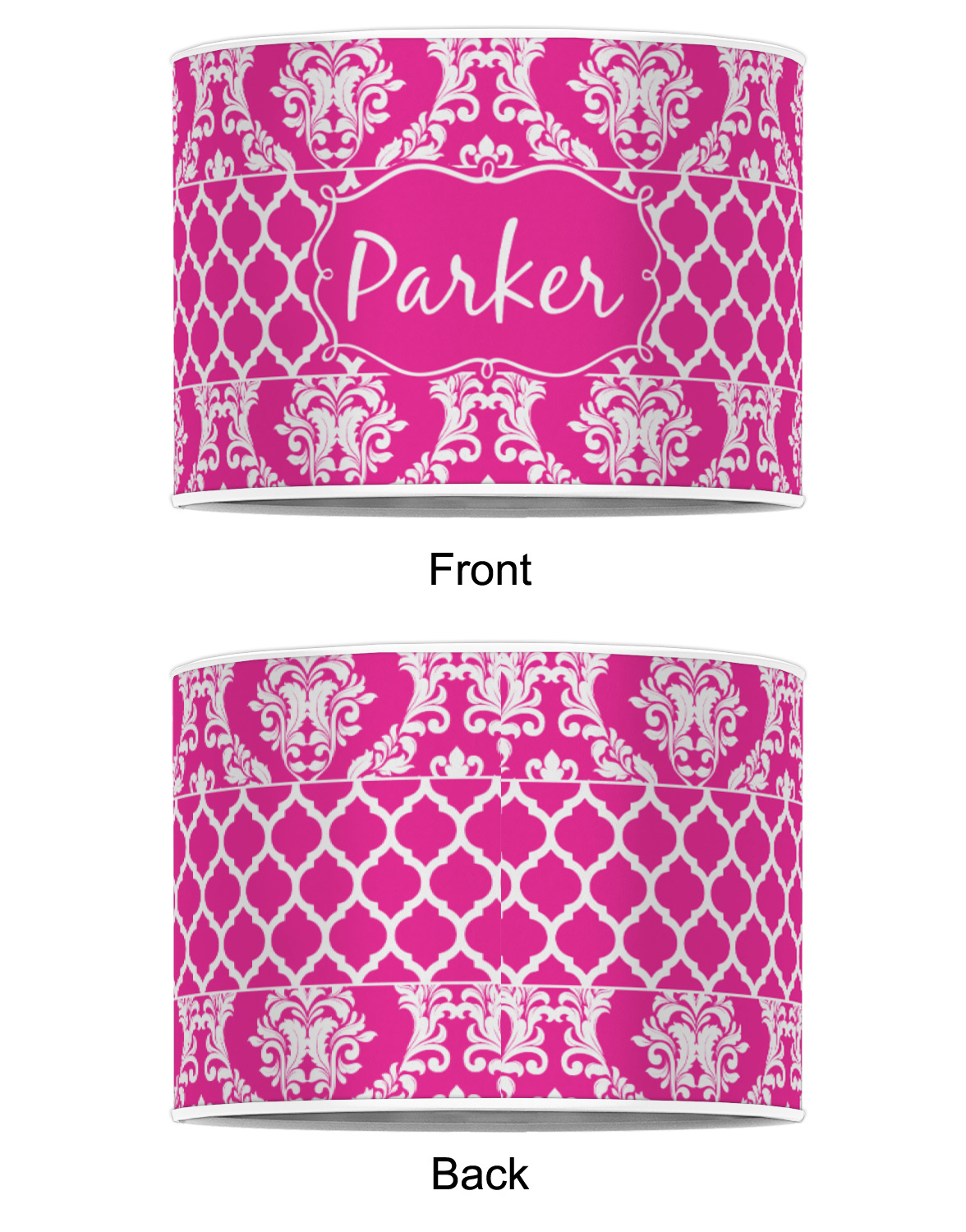 This is one of our new concentric design style - where you can use any two patterns together - we have chose to feature our damask and moroccan / trellis patterns. We chose our hot pink and white for our colors and curlz label with a name for personalization.