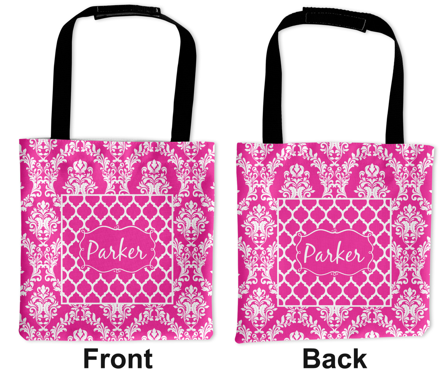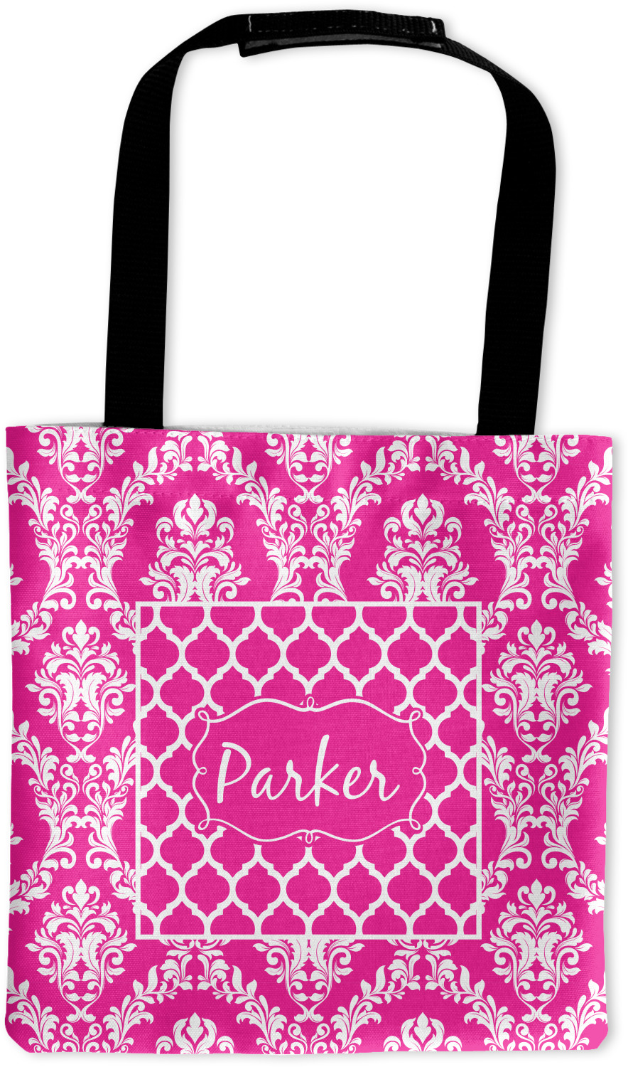 This is one of our new concentric design style - where you can use any two patterns together - we have chose to feature our damask and moroccan / trellis patterns. We chose our hot pink and white for our colors and curlz label with a name for personalization.