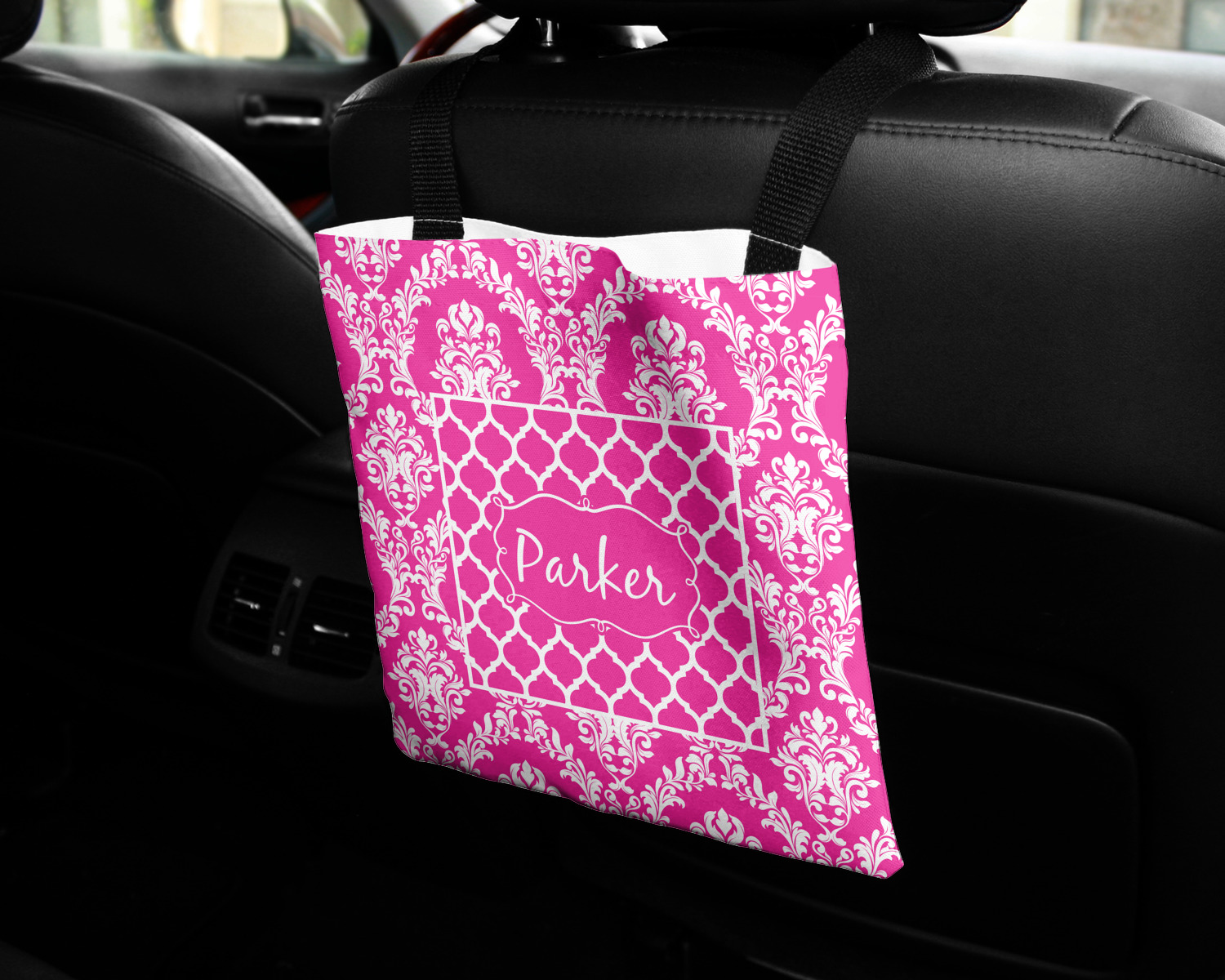 These car back seat organizers are sturdy tote-like bags, fabricated from a robust polyester, and features a single handle on the back side. The strap features an attachable velcro for easy attachment to headrests, grocery carts, car seats, and more. Simply undo the velcro, loop the strap around the headrest, reattach the velcro, and let the organizer hang from the front seat. These car organizers are the perfect means of increasing your backseat's legroom, while storing multiple items in one place for better accessibility. Each car back seat organizer measures at 10 by 10 inches, and features your personalized design printed across its front and back.