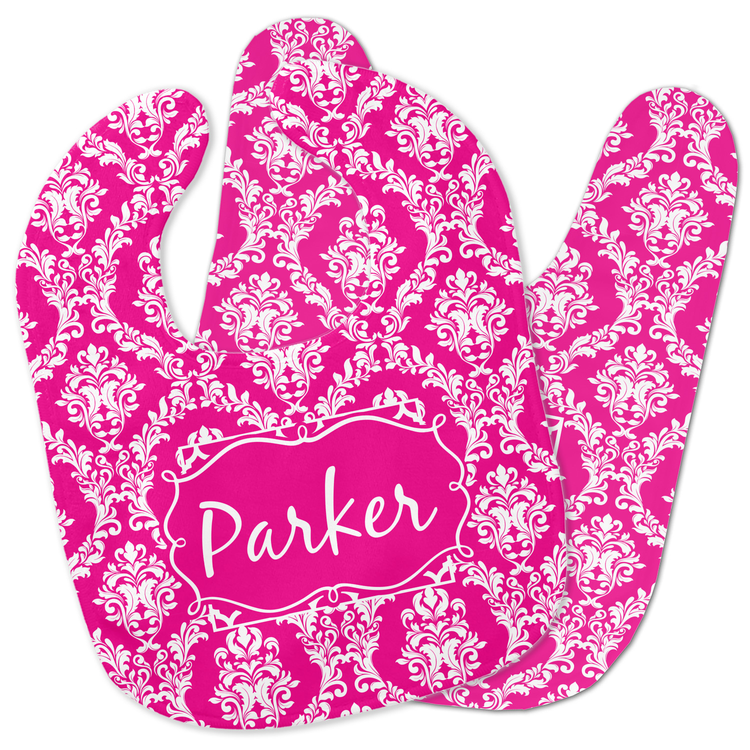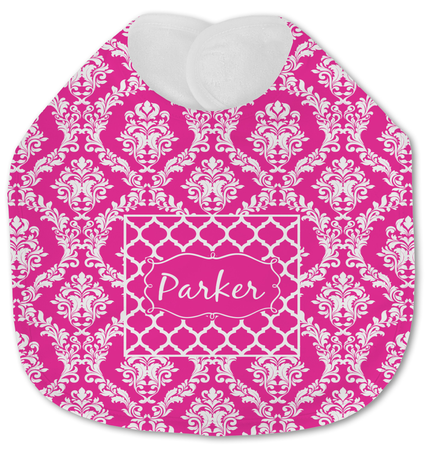This is one of our new concentric design style - where you can use any two patterns together - we have chose to feature our damask and moroccan / trellis patterns. We chose our hot pink and white for our colors and curlz label with a name for personalization.