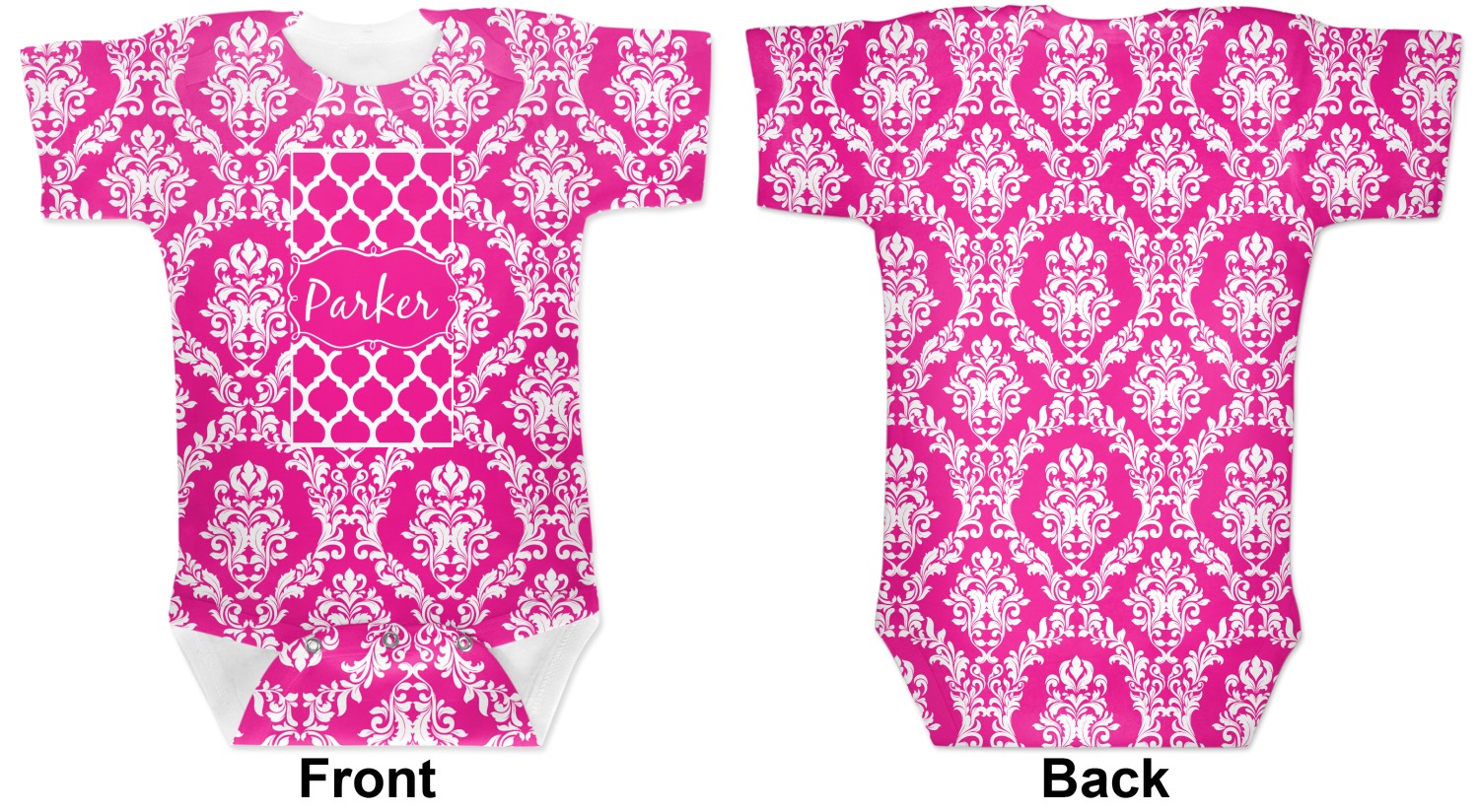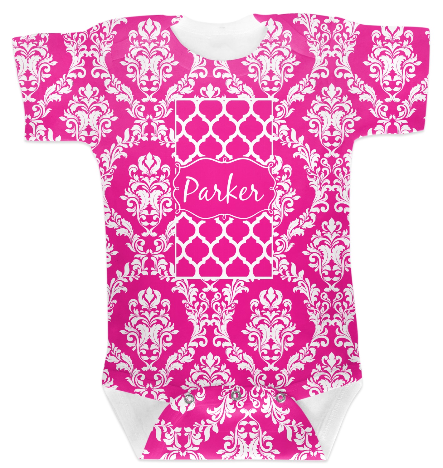 This is one of our new concentric design style - where you can use any two patterns together - we have chose to feature our damask and moroccan / trellis patterns. We chose our hot pink and white for our colors and curlz label with a name for personalization.
