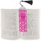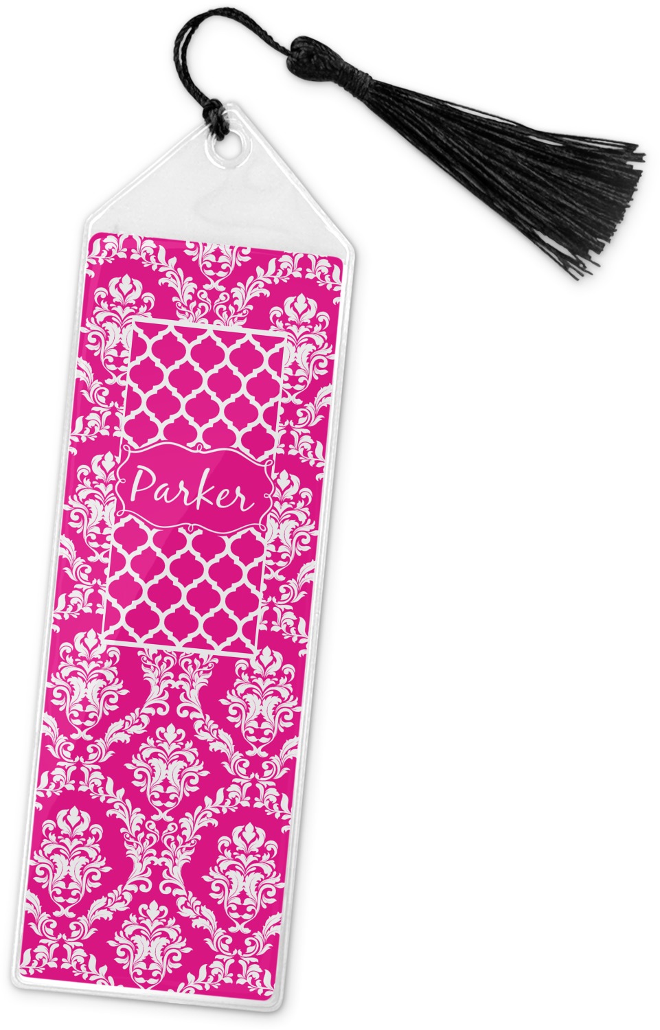 Your personalized bookmark is made of a sturdy, clear vinyl, and is approximately 7.5" x 2.25". We display your personalization on vinyl inserts that are placed on both sides. Accompanying each book marker is a black, fringe tassel that attaches to the reinforced, triangular header.