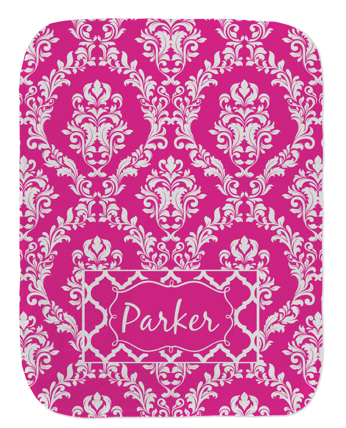 This is one of our new concentric design style - where you can use any two patterns together - we have chose to feature our damask and moroccan / trellis patterns. We chose our hot pink and white for our colors and curlz label with a name for personalization.