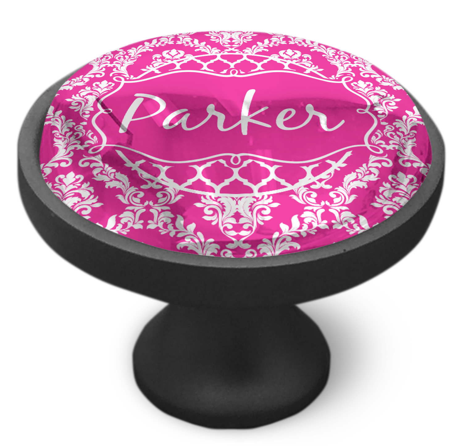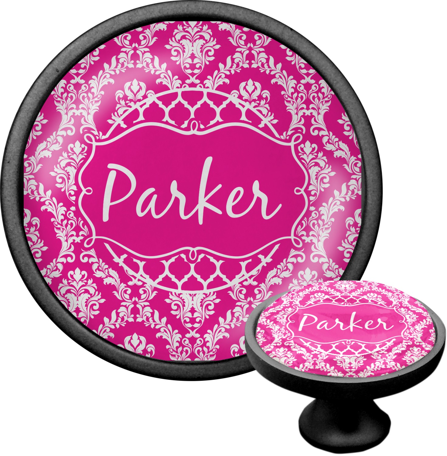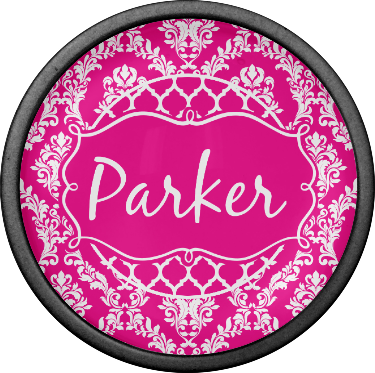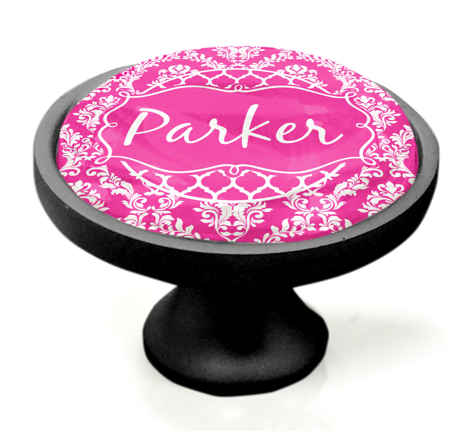This is one of our new concentric design style - where you can use any two patterns together - we have chose to feature our damask and moroccan / trellis patterns. We chose our hot pink and white for our colors and curlz label with a name for personalization.