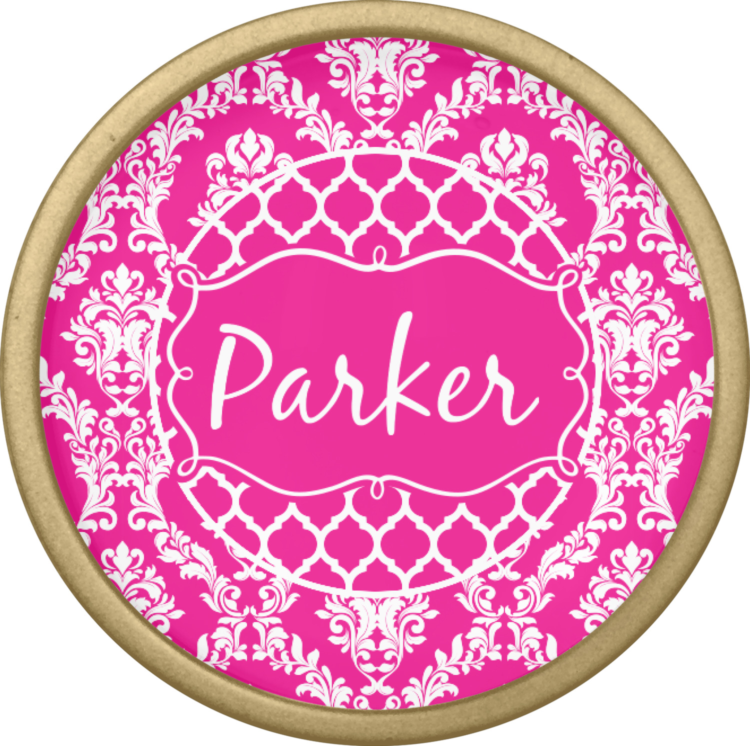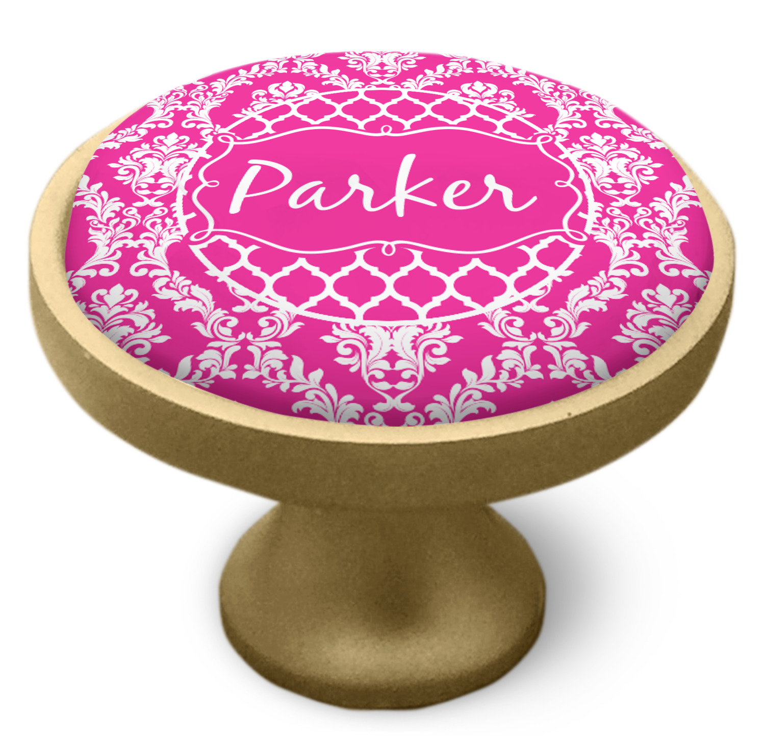 This is one of our new concentric design style - where you can use any two patterns together - we have chose to feature our damask and moroccan / trellis patterns. We chose our hot pink and white for our colors and curlz label with a name for personalization.